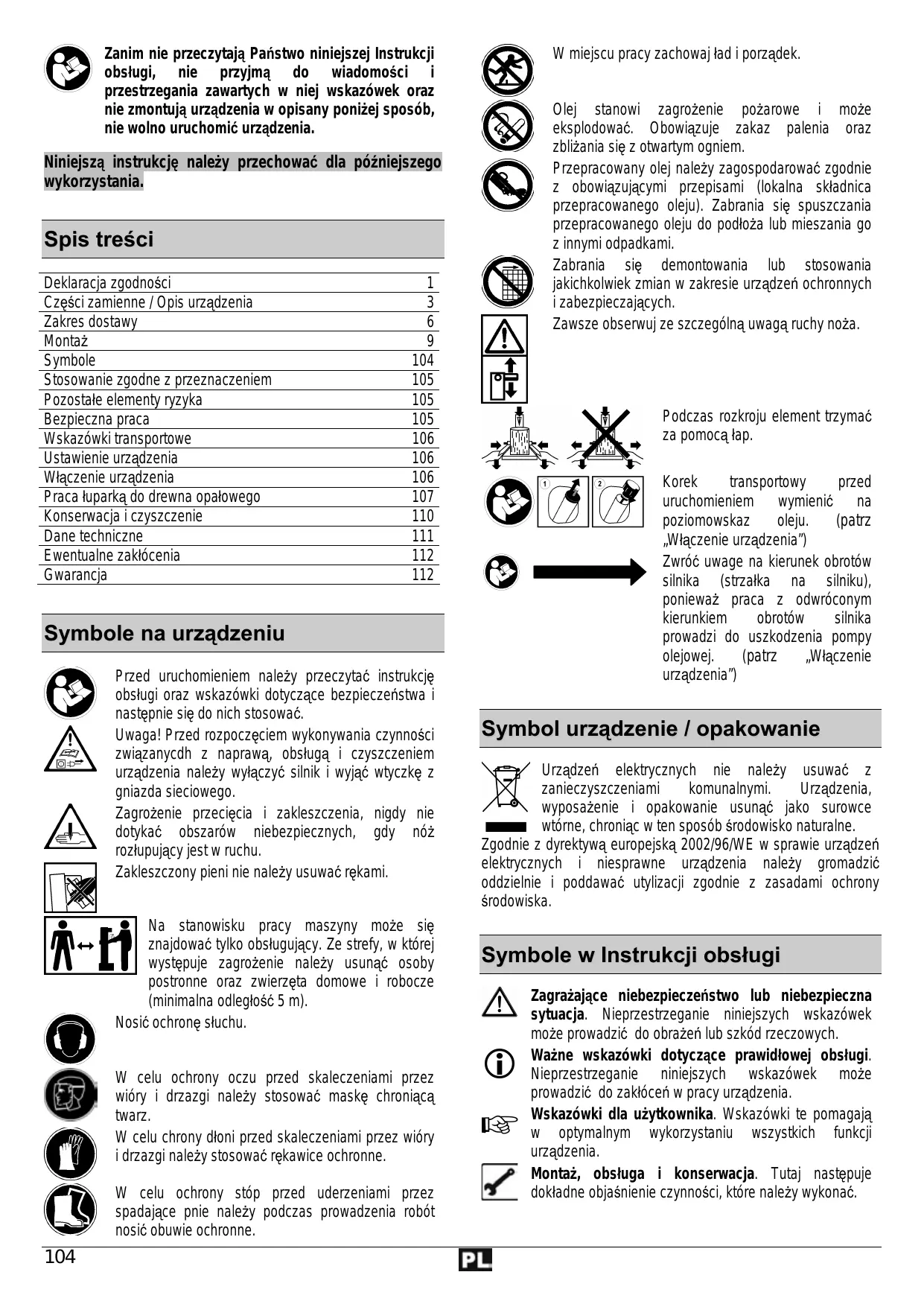 Czesci zamienne / Opis urzadzenia 3 Zakres dostawy 6 Montaz 9 Symbole 104 Stosowanie zgodne z przeznaczeniem 105 Pozostale elementy ryzyka 105 Bezpieczna praca 105 Wskazôwki transportowe 106 Ustawienie urzadzenia 106 Wiaczenie urzadzenia 106 Praca fuparka do drewna opatowego 107 Konsenwacja i czyszczenie 110 Dane techniczne 111 Ewentualne zaklôcenia 112 Gwarancja 112 Symbole na urzadzeniu Przed uruchomieniem nalezy przeczytaé instrukcje obstugi oraz wskazéwki dotyczace bezpieczeñstwa i nastepnie sie do nich stosowaé. Uwaga! Przed rozpoczeciem wykonywania czynnoéci zWiazanycdh z naprawa, obstuga i czyszczeniem urzadzenia nalezy wylaczyé silnik i wyjaé wtyczke z gniazda sieciowego. Zagrozenie przeciecia i zakleszczenia, nigdy nie dotykaé obszarôw niebezpiecznych, gdy n6z rozlupujacy jest w ruchu. Na stanowisku pracy maszyny moze sie znajdowaé tylko obstugujacy. Ze strefy, w ktôrej wystepuje zagrozenie nalezy usunaé osoby 000 *xE FO Zakleszczony pieni nie nalezy usuwaé rekami. postronne oraz zwierzeta domowe i robocze (minimalna odleglosé 5 m). Nosié ochrone stuchu. W celu ochrony oczu przed skaleczeniami przez wiéry i drzazgi nalezy stosowaé maske chroniaca twarz. W celu chrony dioni przed skaleczeniami przez wiôry i drzazgi nalezy stosowaé rekawice ochronne. W celu ochrony stp przed uderzeniami przez spadajace pnie nalezy podczas prowadzenia robôt nosié obuwie ochronne. -#p@Q CO@ W miejscu pracy zachowaj tad i porzadek. moze oraz Olej stanowi zagrozenie pozarowe eksplodowaé. Obowiazuje zakaz palenia zblizania sie z otwartym ogniem. Przepracowany olej nalezy zagospodarowaé zgodnie z obowiazujacymi przepisami (lokalna skladnica przepracowanego oleju). Zabrania sie spuszczania przepracowanego oleju do podioza lub mieszania go z innymi odpadkami. Zabrania sie demontowania lub stosowania jakichkolwiek zmian w zakresie urzadzeñ ochronnych izabezpieczajacych. Zawsze obserwuj ze szczegôlna uwaga ruchy noza. ( Podczas rozkroju element trzymaé DE za pomoca lap. Âke ANT a lp. ï 7 Korek transportowy przed (À Gi uruchomieniem wymienié na poziomowskaz oleju. (patrz 9 QG Wlaczenie urzadzenia") Zwréé uwage na kierunek obrotéw silnika (strzatka na silniku), poniewaz praca z odwrôconym Kierunkiem obrotéw silnika prowadzi do uszkodzenia pompy olejowej. (patz ,Wiaczenie urzadzenia”)