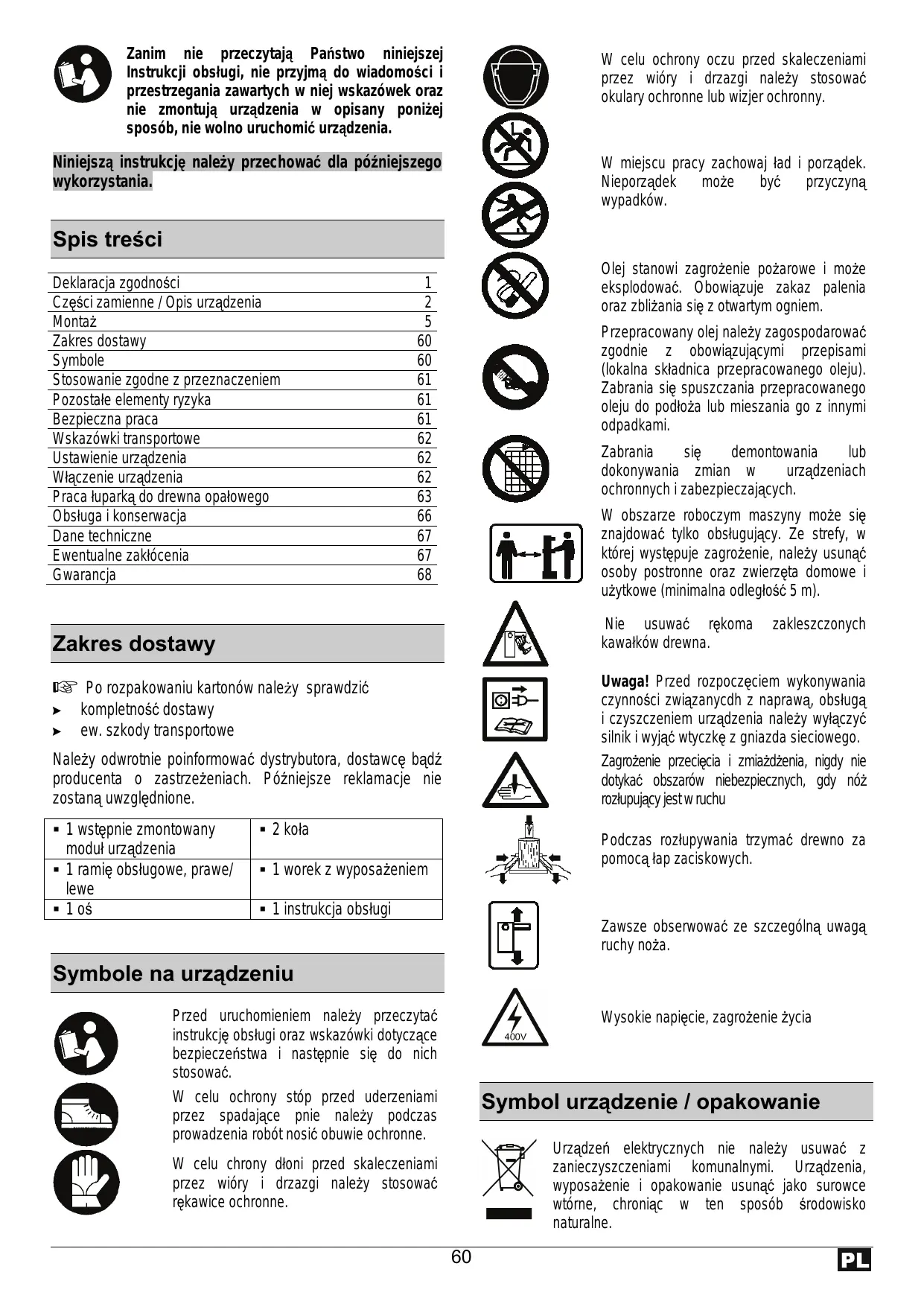 - Udzielona gwarancja nie obejmuje normalné zuźycia eksploatacynyego klina Rozlupujuść, oleju hydraulicznego, prowadników, uzzczelek oraz kół jezdnych.