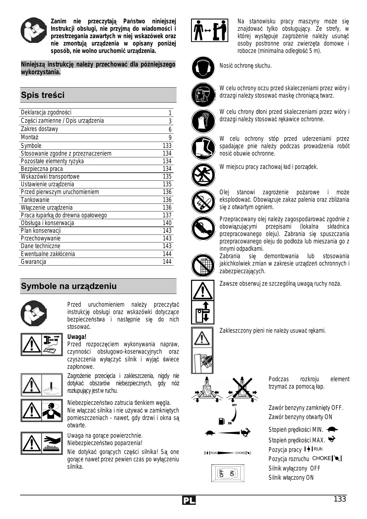 Olej stanowi zagrozenie pozarowe i moze eksplodowaé. Obowiazuje zakaz palenia oraz zblizania sie z otwartym ogniem. Przepracowany olej nalezy zagospodarowaé zgodnie z obowiazujacymi przepisami (lokalna skladnica przepracowanego oleju). Zabrania sie spuszczania przepracowanego oleju do podioza lub mieszania go z innymi odpadkami. PEN Zabrania sie demontowania lub stosowania HA jakichkolwiek zmian w zakresie urzadzer ochronnych i Symbole na urzadzeniu Przed uruchomieniem nalezy przeczytaé instrukcje obstugi oraz wskazéwki dotyczace bezpieczeristwa i nastepnie sie do nich stosowaé. Uwaga! Przed rozpoczeciem wykonywania napraw, czynnoéci obstugowo-koserwacyinych oraz czyszczenia wylaczyé silnik i wyjaé $wiece zaplonowe. Zagrozenie przeciecia i zakleszczenia, nigdy nie dotykaé obszaréw niebezpiecznych, gdy n6z rozlupujacy jestw ruchu. Niebezpieczeñstwo zatrucia tlenkiem wegla. Nie wlaczaé silnika i nie uzywaé w zamknietych pomieszczeniach - nawet, gdy drzwi i okna sa otwarte. Uwaga na gorace powierzchnie. Niebezpieczeñstwo poparzenia! Nie dotykaé goracych czesci silnika! Sa one gorace nawet przez pewien czas po wylaczeniu silnika. 2 zabezpieczajacych. Zawsze obserwuj ze szczegôlna uwaga ruchy noza. Zakleszczony pieni nie nalezy usuwaé rekami. Podczas rozkroju element trzymaé za pomoca lap. Zawr benzyny zamkniety OFF. ) Zawôr benzyny otwarty ON B « Ps œ@ Stopieñ predkoéci MIN. Stopieñ predkosci MAX. La Pozycja pracy 14 1RUN Pozycja rozruchu CHOKEÏ\& | É Silnik wylaczony OFF l Silnik wtaczony ON