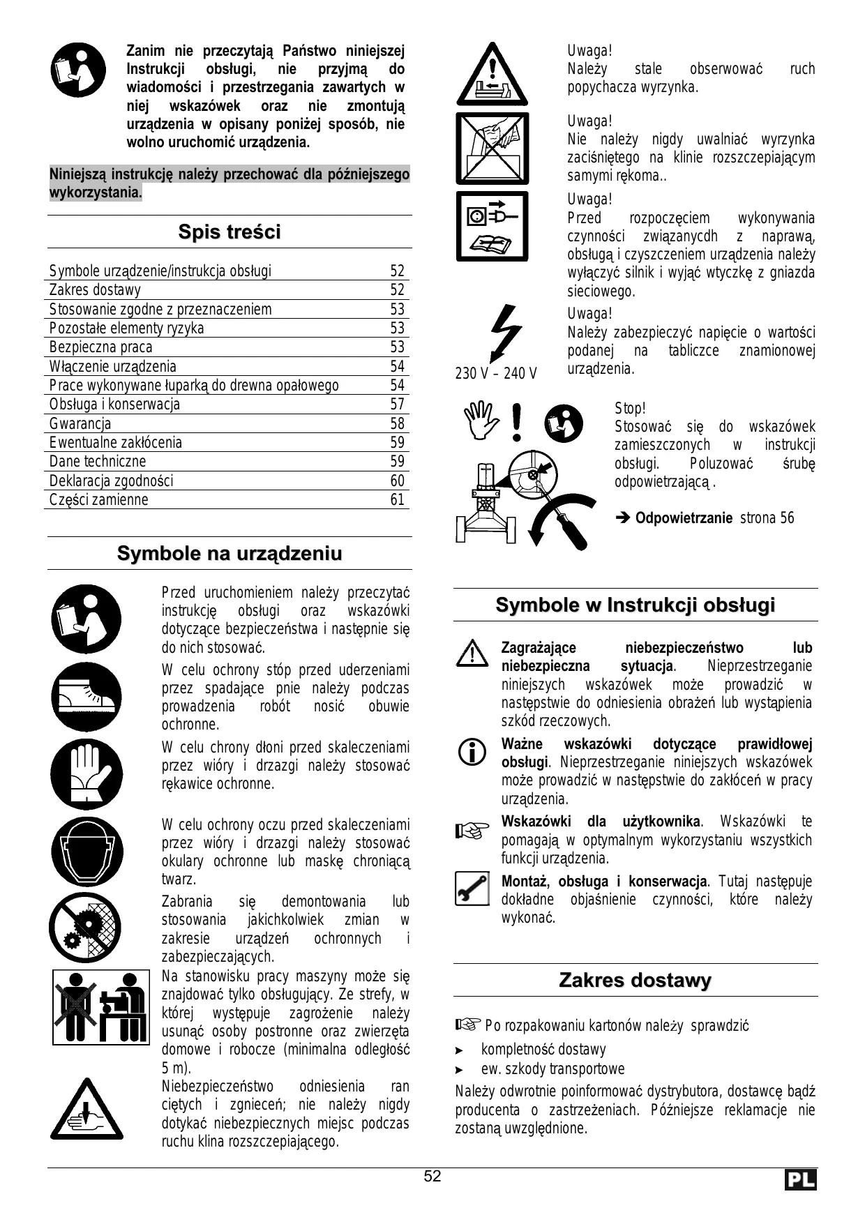 Zanim nie przeczytają Państwo niniejszej Instrukcji obsługi, nie przyjmą do wiadomości i przestrzegania zawartych w niej wskazówek oraz nie zmontują urządzenia w opisany poniżej sposób, nie wolno uruchomić urządzenia. Uwaga! Należy stale obserwować popychacza wyrzynka. Niniejszą instrukcję należy przechować dla późniejszego wykorzystania. Spis treści Symbole urządzenie/instrukcja obsługi Zakres dostawy Stosowanie zgodne z przeznaczeniem Pozostałe elementy ryzyka Bezpieczna praca Włączenie urządzenia Prace wykonywane łuparką do drewna opałowego Obsługa i konserwacja Gwarancja Ewentualne zakłócenia Dane techniczne Deklaracja zgodności Części zamienne