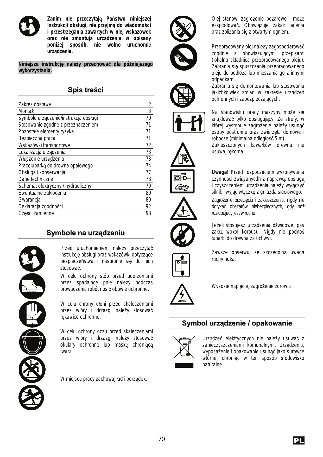 Zanim nie przeczytają Państwo niniejszej Instrukcji obsługi, nie przyjmą do wiadomości i przestrzegania zawartych w niej wskazówek oraz nie zmontują urządzenia w opisany poniżej sposób, nie wolno uruchomić urządzenia. Olej stanowi zagrożenie pożarowe i może eksplodować. Obowiązuje zakaz palenia oraz zbliżania się z otwartym ogniem. Przepracowany olej należy zagospodarować zgodnie z obowiązującymi przepisami (lokalna składnica przepracowanego oleju). Zabrania się spuszczania przepracowanego oleju do podłoża lub mieszania go z innymi odpadkami. Zabrania się demontowania lub stosowania jakichkolwiek zmian w zakresie urządzeń ochronnych i zabezpieczających. Niniejszą instrukcję należy przechować dla późniejszego wykorzystania. Spis treści Zakres dostawy Montaż Symbole urządzenie/instrukcja obsługi Stosowanie zgodne z przeznaczeniem Pozostałe elementy ryzyka Bezpieczna praca Wskazówki transportowe Lokalizacja urządzenia Włączenie urządzenia Pracełuparką do drewna opałowego Obsługa i konserwacja Dane techniczne Schemat elektryczny / hydrauliczny Ewentualne zakłócenia Gwarancja Deklaracja zgodności Części zamienne