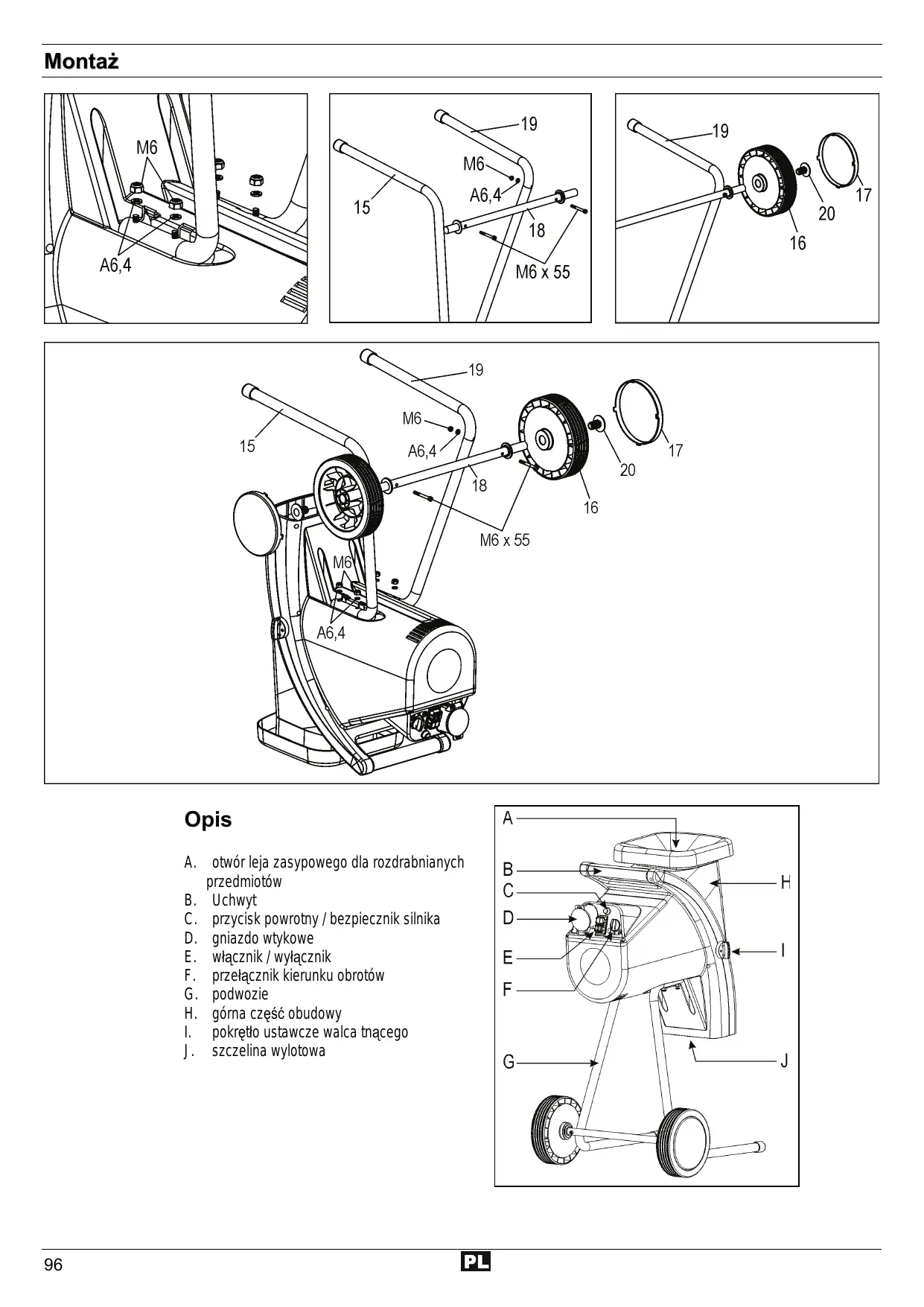 Montaż Opis A. otwór leja zasypowego dla rozdrabnianych przedmiotów B. Uchwyt C. przycisk powrotny / bezpiecznik silnika D. gniazdo wtykowe E. włącznik / wyłącznik F. przełącznik kierunku obrotów G. podwozie H. górna część obudowy