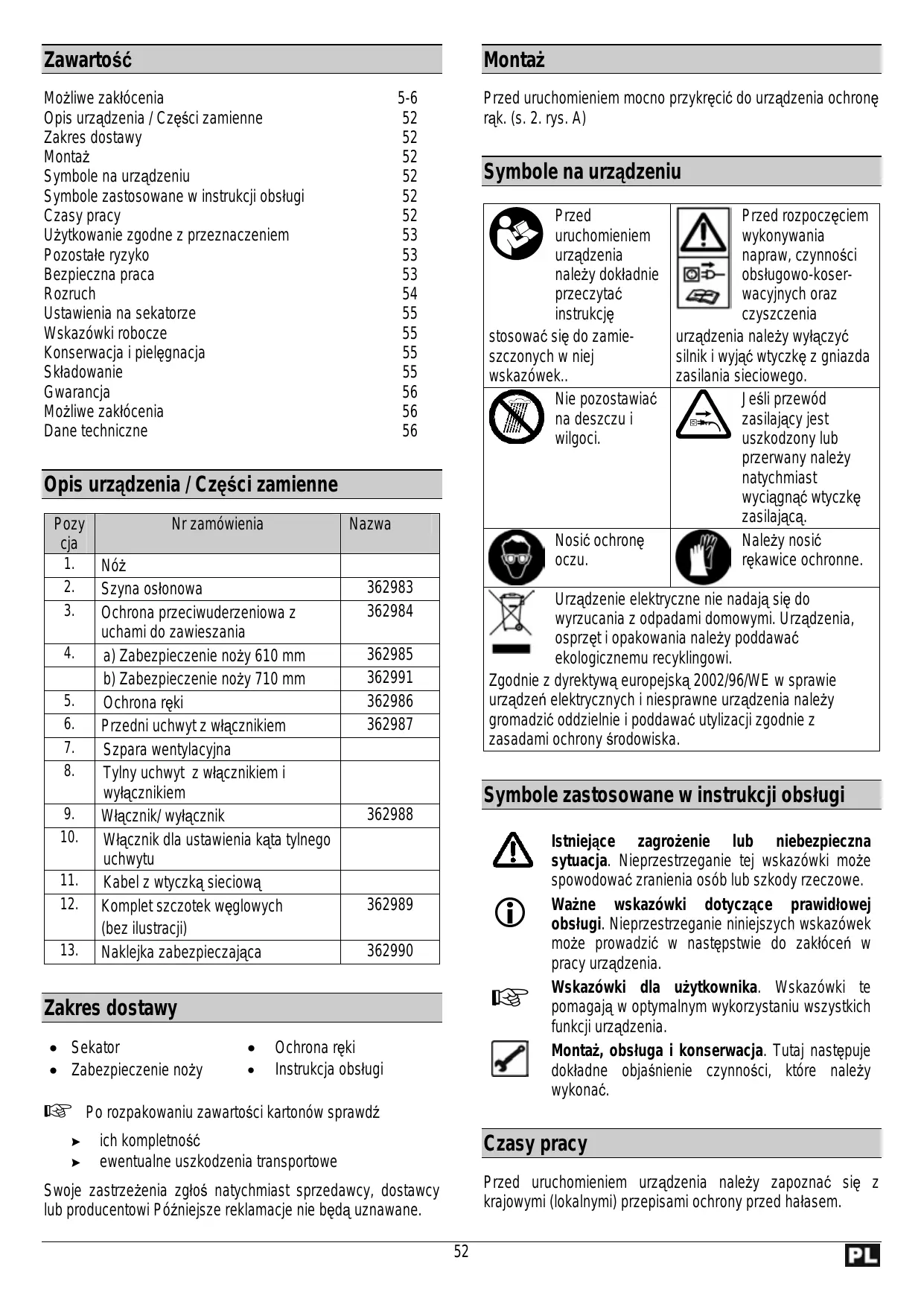 Mozliwe zaklécenia 5-6 Opis urzadzenia / Czeéci zamienne 52 Zakres dostawy 52 Montaz 52 Symbole na urzadzeniu 52 Symbole zastosowane w instrukcji obstugi 52 Czasy pracy 52 Uzytkowanie zgodne z przeznaczeniem 53 Pozostale ryzyko 53 Bezpieczna praca 53 Rozruch 54 Ustawienia na sekatorze 55 Wskazôwki robocze 55 Konserwacja i pielegnacja 55 Skladowanie 55 Gwarancja 56 Mozliwe zaklécenia 56 Däne techniczne 56