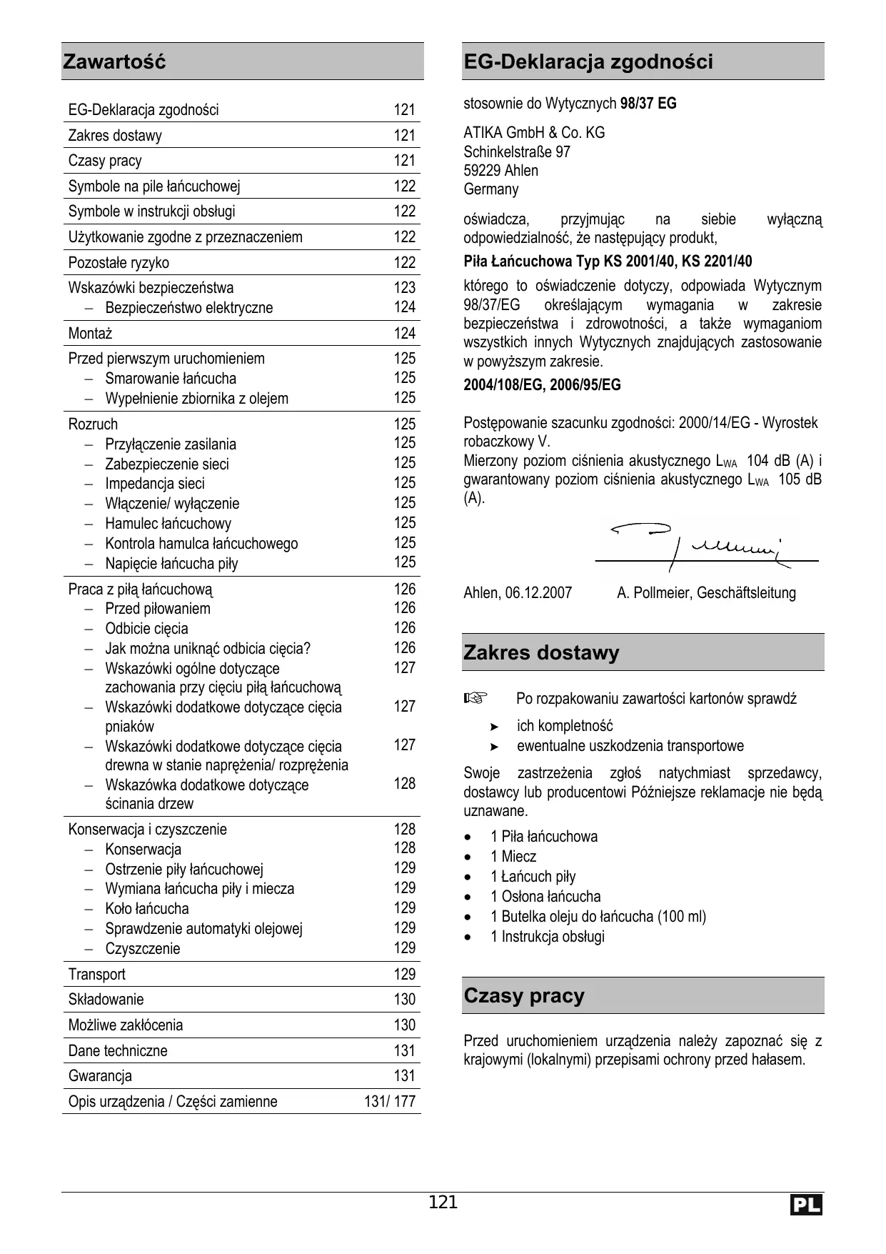 KS 2201 - Piła łańcuchowa ATIKA - Bezpłatna instrukcja obsługi