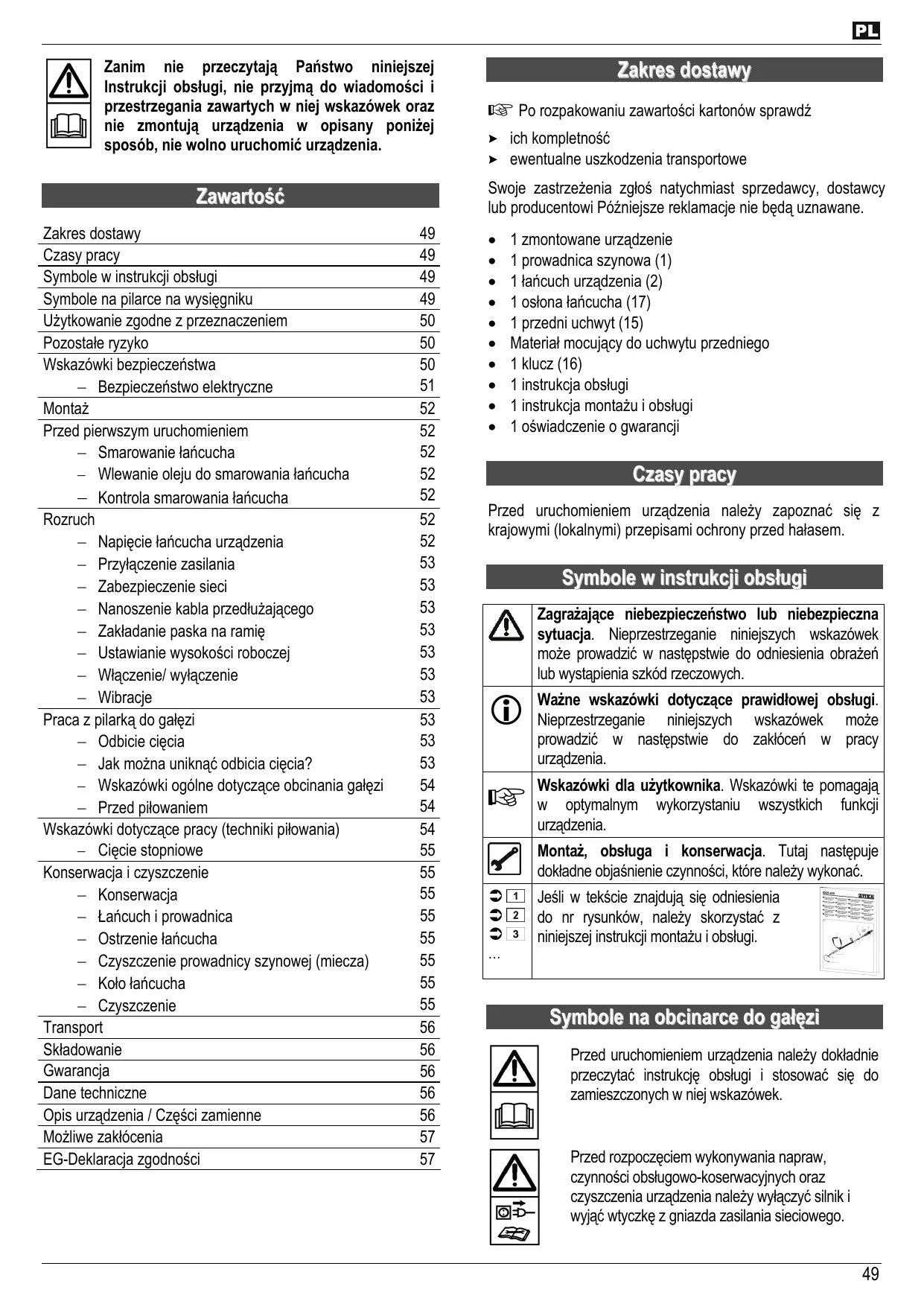 Zakres dostawy 49 . Czasy pracy 49 . Symbole w instrukcji obstugi 49 . Symbole na pilarce na wysiegniku 49 . Uzytkowanie zgodne z przeznaczeniem 50 . Pozostale ryzyko 50 . Wskazowki bezpieczeñstwa 50 .