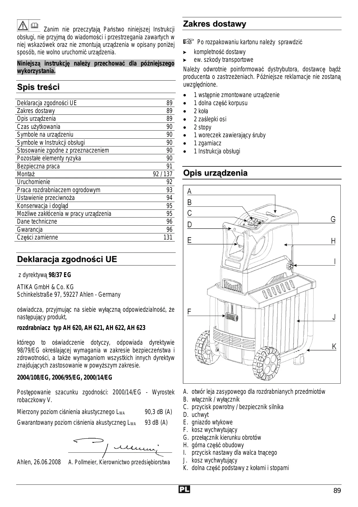 °__1 wstepnie zmontowane urzadzenie Deklaracja zgodno$ci UE 89 + 1 dolna czesé korpusu Zakres dostawy 89 + 2kola Opis urzadzenia 89 + 2zaslepkiosi Czas u2ytkowania 90 + 2stopy Symbole na urzadzeniu 90 + 1 woreczek zawierajacy éruby Symbole w Instrukcji obstugi 90 + 1zgarniacz Stosowanie zgodne z przeznaczeniem 90 + Linstrukcja obstugi Pozostale elementy ryzyka 90 Bezpieczna praca 91 = = Montaz 92/13 Opis urzadzenia Uruchomienie 92 Praca rozdrabniaczem ogrodowym 93 Ustawienie przeciwnoza 94 Konsenwacja i doglad 95 Mozliwe zaktécenia w pracy urzadzenia 95 Dane techniczne 96 Gwarancja %6