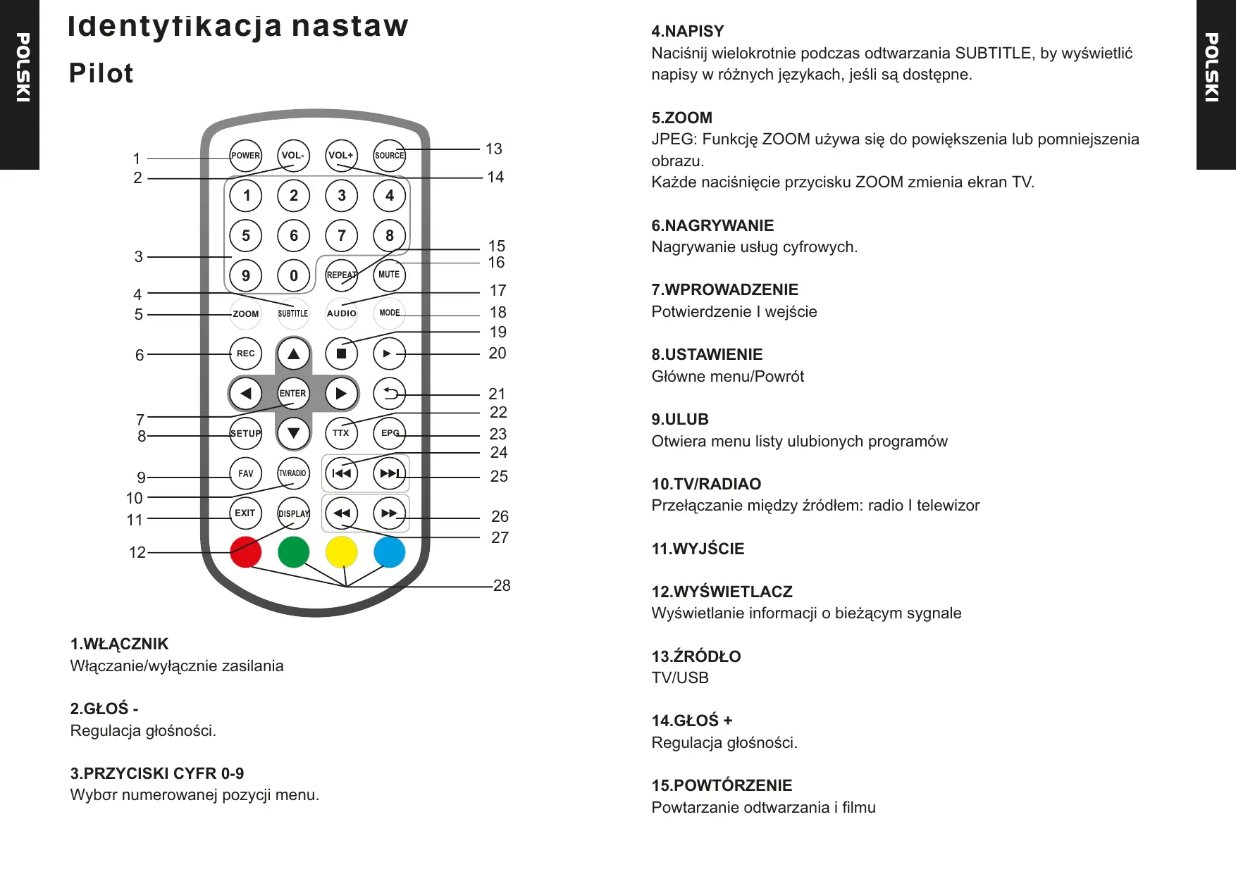 9.ULUB Otwiera menu listy ulubionych programów 10.TV/RADIAO Przełączanie między źródłem: radio I telewizor
