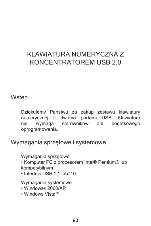 KONCENTRATOREM USB 2.0 Wstęp Dziękujemy Państwu za zakup zestawu klawiatury numerycznej z dwoma portami USB. Klawiatura nie wymaga sterowników ani dodatkowego oprogramowania. Wymagania sprzętowe i systemowe Wymagania sprzętowe