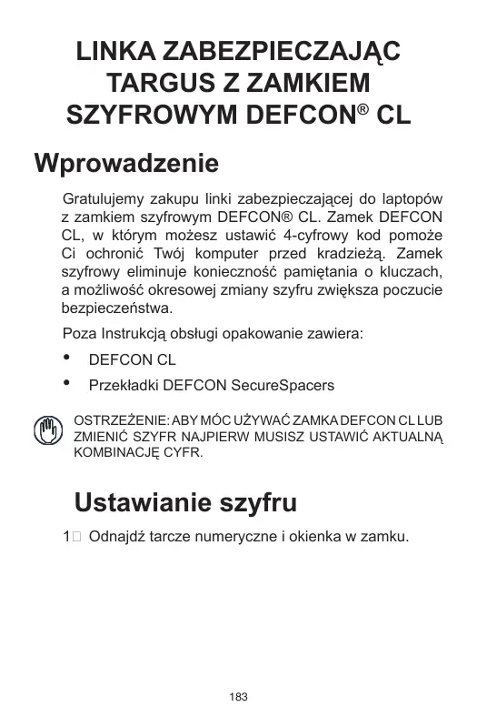 Wprowadzenie Gratulujemy zakupu linki zabezpieczającej do laptopów z zamkiem szyfrowym DEFCON® CL. Zamek DEFCON CL, w którym możesz ustawić 4-cyfrowy kod pomoże Ci ochronić Twój komputer przed kradzieżą. Zamek szyfrowy eliminuje konieczność pamiętania o kluczach, a możliwość okresowej zmiany szyfru zwiększa poczucie bezpieczeństwa. Poza Instrukcją obsługi opakowanie zawiera:
