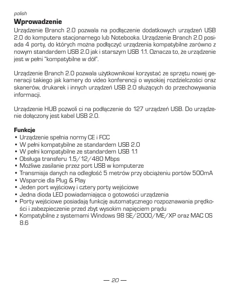 Urzadzenie Branch 2.0 pozwala uzytkownik korzystać ze sprętçu nowej generaciţa takiego jak kamery do video konferencji o wysokiejrozdiozielność oraz skanerów, drukarek i innych urzadzeń USB 2.0 sLUZYCych do przechowyyania informacią.