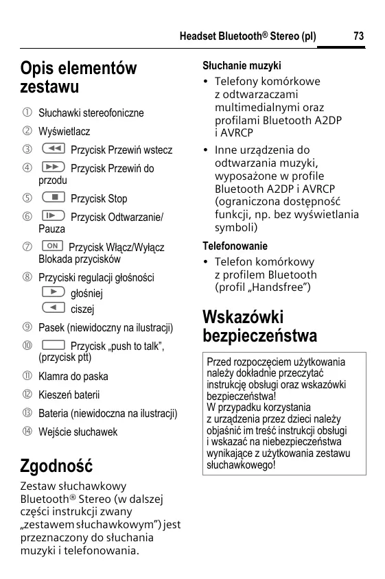 Headset Bluetooth® Stereo (pl) 73 Opis elementow zestawu Stuchawki stereofoniczne Wyéwietlacz CI Przycisk Przewif wstecz D>) Przycisk Przewin do przodu Ca] Przycisk Stop > (1) Przycisk Odtwarzanie/ Pauza )] Przycisk Wiacz/Wylacz Blokada przyciskôw D Przycisk regulaci gloénoéci C>) gloéniej I disze) > Pasek (niewidoczny na ilustraci) C7] Przycisk push to talk”, przycisk pit) Klamra do paska Kieszeñ bateri Bateria (niewidoczna na lustracii) Wejscie sluchawek Zgodnosé Zestaw stuchawkowy Bluetooth® Stereo (w dalszej czesci instrukcji zwany ,zestawem stuchawkowym")jest przeznaczony do stuchania muzyki i telefonowania. Stuchanie muzyki Telefony komôrkowe 2 odtwarzaczami multimedialnymi oraz profilami Bluetooth A2DP i AVRCP Inne urzadzenia do odtwarzania muzyki, wyposazone w profile Bluetooth A2DP i AVRCP (ograniezona dostepnosé funkcji, np. bez wy$wietlania symboli) Telefonowanie + Telefon komérkowy z profilem Bluetooth (profil ,Handsfree") Wskazôwki bezpieczeñstwa Przed rozpoczeciem uèylkowania naley doktadnie przeczytaé instrukcje obslugi oraz wskazéwki bezpieczeñstwal W przypadku Korzystania 2 urzadzenia przez dzieci nalezy objaénié im tre$é instruk ji obstugi i wskazaé na niebezpieczeñstwa wynikajace z uytkowania zestawu sluchawkowegol