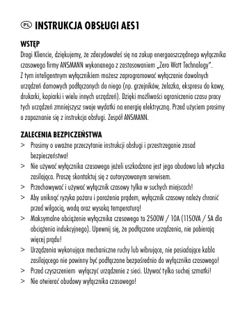> Prosimy o uważne przeczytanie instrukcji obsługi i przestrzeganie zasad bezpieczeństwa! > Nie używać wyłącznika czasowego jeżeli uszkodzona jest jego obudowa lub wtyczka zasilająca. Proszę skontaktuj się z autoryzowanym serwisem. > Przechowywać i używać wyłącznik czasowy tylko w suchych miejscach! > Aby uniknąć ryzyka pożaru i porażenia prądem, wyłącznik czasowy należy chronić przed wilgocią, wodą oraz wysoką temperaturą! > Maksymalne obciążenie wyłącznika czasowego to 2500W / 10A (1150VA / 5A dla obciążenia indukcyjnego). Upewnij się, że podłączone urządzenia, nie pobierają więcej prądu! > Urządzenia wykonujące mechaniczne ruchy lub wibrujące, nie posiadające kabla zasilającego nie powinny być podłączane bezpośrednio do wyłącznika czasowego! > Przed czyszczeniem wyłączyć urządzenie z sieci. Używać tylko suchej szmatki! > Nie otwierać obudowy wyłącznika czasowego! > Przechowywać i używać z dala od dzieci! > Używanie wyłącznika czasowego niezgodnie z instrukcją może doprowadzić do uszkodzenia urządzenia lub spowodować inne niebezpieczne sytuacje! > Wyłącznik czasowy podłączać tylko do odpowiednich gniazd sieciowych! FUNKCJE > Inteligentny wyłącznik czasowy z zastosowaniem „Zero Watt Technology“ > Nie pobiera energii w stanie gotowości > Automatyczne odcięcie zasilania, po ustalonym czasie pracy (15min, 30min, 1h, 2h, 4h, 8h - czasy możliwe do ustawienia) > Łatwy w obsłudze - tylko jednym przyciskiem > Wskaźnik LED sygnalizujący czas pracy urządzenia > Maksymalne obciążenie 2500W / 10A (1150VA / 5A dla obciążenia indukcyjnego) UŻYTKOWANIE Włóż wyłącznik czasowy do odpowiedniego gniazda sieciowego. Wyłącznik czasowy jest gotowy do użycia, ale nadal nie jest włączone zasilanie na wyjściu. Podłącz obciążenie. Naciśnij i przytrzymaj przez 2 sekundy przycisk „START-STOP” aby włączyć zasilanie na 15minut. Każde następne naciśnięcie przycisku podwaja czas pracy, aż do 8 godzin. Czas pracy wyłącznika możliwy do wybrania to 15 minut, 30 minut, 1 godzina, 2 godziny, 4 godziny lub 8 godzin. Informacja o czasie pracy wyłącznika jest widoczna poprzez poszczególne wskaźniki LED. Czas pracy może zostać zmieniony w każdej chwili przez naciśnięcie przycisku „START-STOP”. Jeżeli chcesz wyłączyć zasilanie natychmiast, musisz wybrać „8h” i naciskać przycisk „START-STOP” dłuższy czas. W tym momencie zacznie migać przez około 10sekund wskaźnik LED „15min”. Następnie wyłącznik czasowy automatycznie odłączy zasilanie i nie będzie zużywał więcej energii elektrycznej. Wyłącznik czasowy może pozostać na stałe w gnieździe sieciowym, (z podłączonym do niego lub nie obciążeniem). OCHRONA ŚRODOWISKA Nie wyrzucać tego urządzenia razem z innymi domowymi odpadami. Zużyte urządzenie należy przekazać do odpowiednich punktów zbiórki zużytego sprzętu elektrycznego celem dalszego recyklingu. Informacji na temat systemu zbiórki zużytego sprzętu elektrycznego należy szukać u sprzedawców. Wszystkie materiały użyte do opakowania tego urządzenia należy poddać recyklingowi w celu ochrony środowiska. DANE TECHNICZNE Zasilanie: 230V AC / 50Hz Obciążenie: Max 2500W / 10A - obc. rezystancyjne Max 1150VA / 5A - obc. indukcyjne (np. silnik elektryczny) Pobór energii: około. 0,5 W podczas użytkowania 0 W w trybie czuwania UWAGA Informacja zawarta w tej instrukcji może zostać zmieniona bez wcześniejszego powiadomienia. Firma ANSMANN nie ponosi odpowiedzialności za niewłaściwe użytkowanie produktu lub użytkowanie niezgodne z instrukcją. WARUNKI GWARANCJI Na ten produkt oferujemy 3 lata gwarancji. Gwarancja nie obejmuje uszkodzeń spowodowanych przez nie przestrzeganie instrukcji obsługi lub niewłaściwe używanie. RO Instructiuni de utilizare AES1 CUVANT INAINTE Stimati clienti, va multumim pentru achizitionarea prizei temporizate AES1 cu functie de economie de energie (tehnologie Zero Watt) de la ANSMANN. La aceasta priza temporizata puteti conecta consumatori (de ex. ventilatoare, fier de calcat, masini de cafea, imprimante, copiatoare, si multe altele) pentru un timp reglat anterior si prin aceasta sa reduceti costurile de curent electric in regim standby. Va rugam sa cititi cu atentie instructiunile de utilizare inainte de punerea in functiune a prizei. Echipa ANSMANN va multumeste