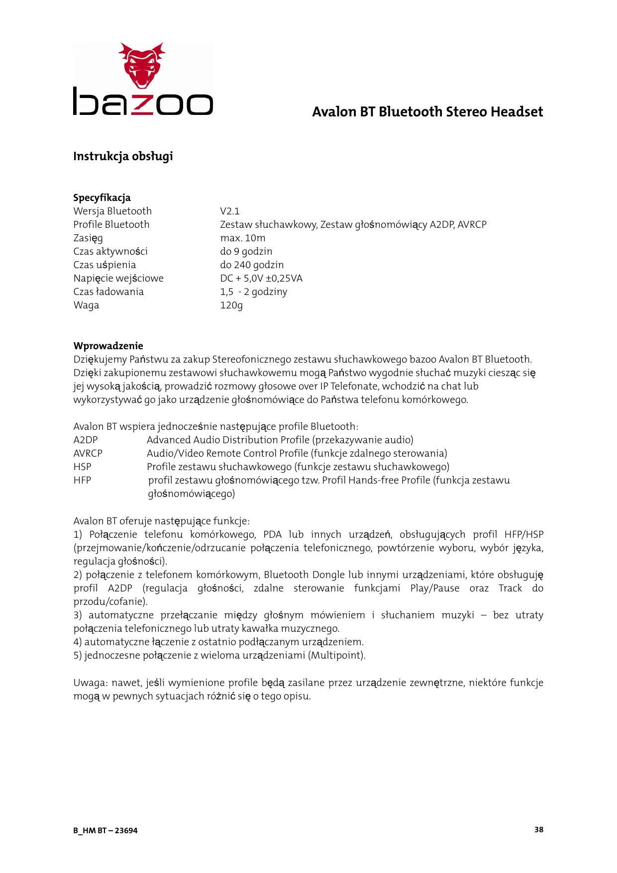 Dziekujemy Państwu za zakup Stereofonicznego zestawu słuchawkowygo bazoo Avalon BT Bluetooth. Dzięki zakupionemu zestawowy słuchawkowemu moga Państwo wygodnia słucha muzyki cieszac sie jej wysoka jakoccia, prowadzić rozmowy golems over IP Telefonate, wchodzic na chat lub wykorzystwyac go jako urzadzenia gośnomówie do Państwa Telefonu komórkowej.