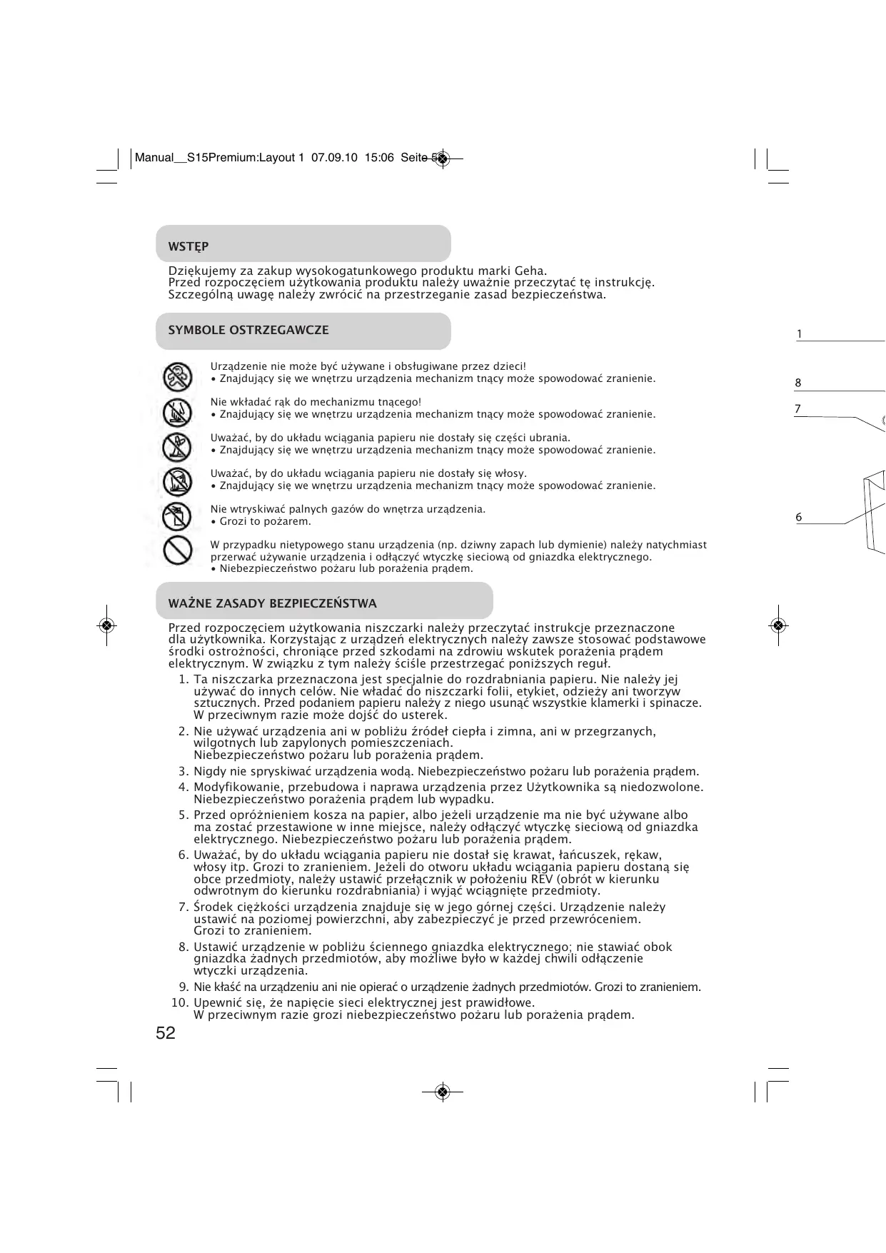 Przed Rozpoczeciem uzytkowania niszczarki nalez przyeczyac instrukcje przyznaczone dla uzytkownika. Korzystajac z urzadzen elektrycznych nalez yawsz stosowac podstawowe srodki ostrożnosci, chroniace przezd szkodami na zdrowiu wskutek porazenia pradem elektrycznym. W zwiazku z tym nalez scise przestręgać ponijszych reguţ.