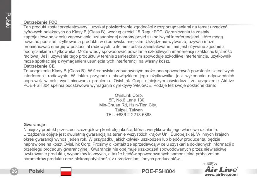 Polski Ostrzeżenie FCC Ten produkt został przetestowany i uzyskał potwierdzenie zgodności z rozporządzeniami na temat urządzeń cyfrowych należących do Klasy B (Class B), według części 15 Reguł FCC. Ograniczenia te zostały zaprojektowane w celu zapewnienia uzasadnionej ochrony przed szkodliwymi interferencjami, które mogą powstać podczas użytkowania produktu w środowisku miejskim. Urządzenie wytwarza, używa i może promieniować energię w postaci fal radiowych, o ile nie zostało zainstalowane i nie jest używane zgodnie z podręcznikiem użytkownika. Może wtedy spowodować powstanie szkodliwych interferencji i zakłócać łączność radiową. Jeśli używanie tego produktu w terenie zamieszkałym spowoduje szkodliwe interferencje, użytkownik może spotkać się z wymaganiem usunięcia tych interferencji na własny koszt. Ostrzeżenie CE To urządzenie Klasy B (Class B). W środowisku zabudowanym może ono spowodować powstanie szkodliwych interferencji radiowych. W takim przypadku obowiązkiem jego użytkownika jest wykonanie odpowiednich poprawek w celu wyeliminowania problemu. OvisLink Corp. niniejszym oświadcza, że urządzenie AirLive POE-FSH804 spełnia podstawowe wymagania dyrektywy 99/05/CE. Podaje też swoje dokładne dane: OvisLink Corp. 5F, No.6 Lane 130, Min-Chuan Rd, Hsin-Tien City, Taipei, Taiwan
