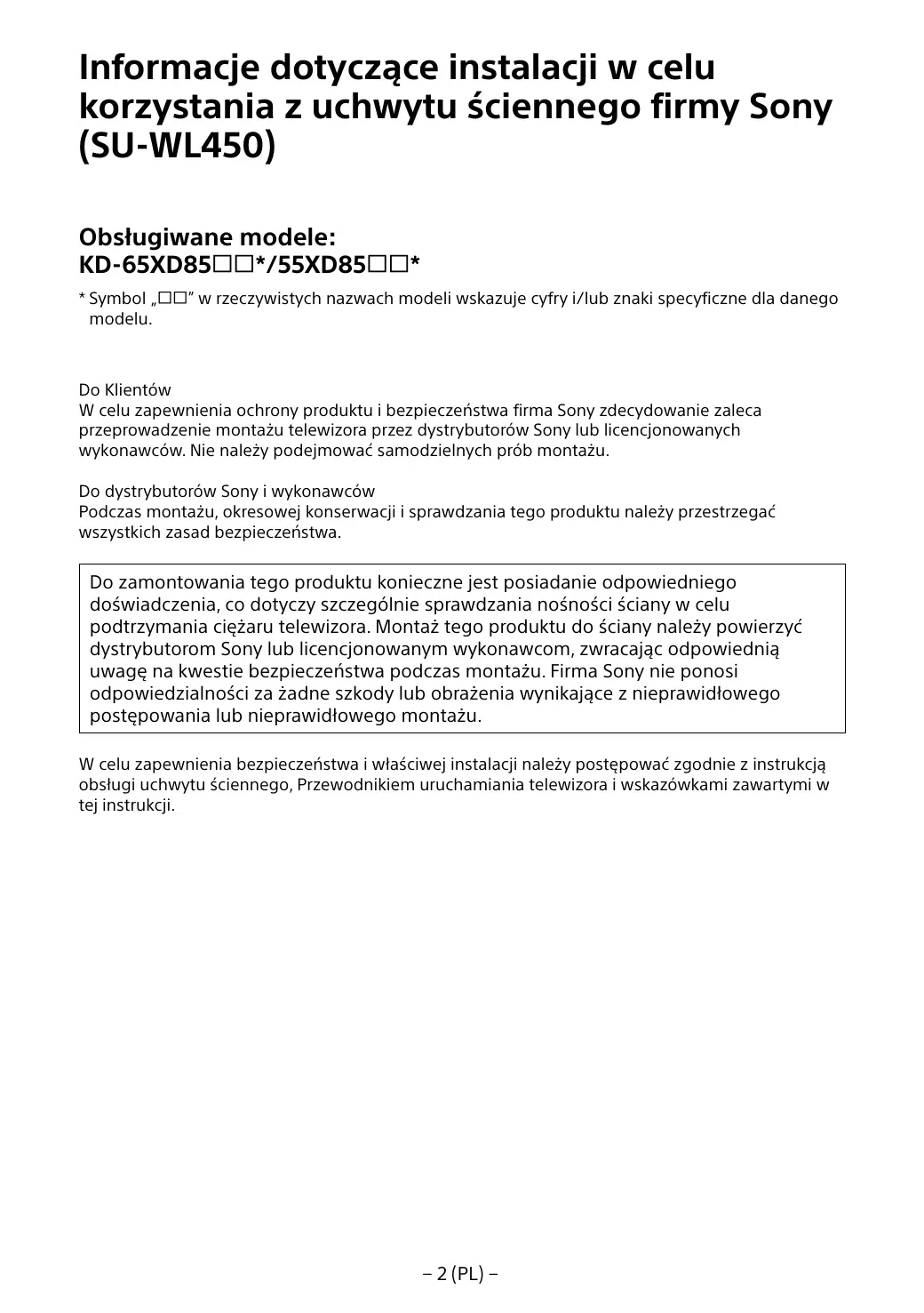 Do Klientów W celu zapewnienia ochrony produktu i bezpieczeństwa firma Sony zdecydowanie zaleca przeprowadzenie montażu telewizora przez dystrybutorów Sony lub licencjonowanych wykonawców. Nie należy podejmować samodzielnych prób montażu. Do dystrybutorów Sony i wykonawców Podczas montażu, okresowej konserwacji i sprawdzania tego produktu należy przestrzegać wszystkich zasad bezpieczeństwa.