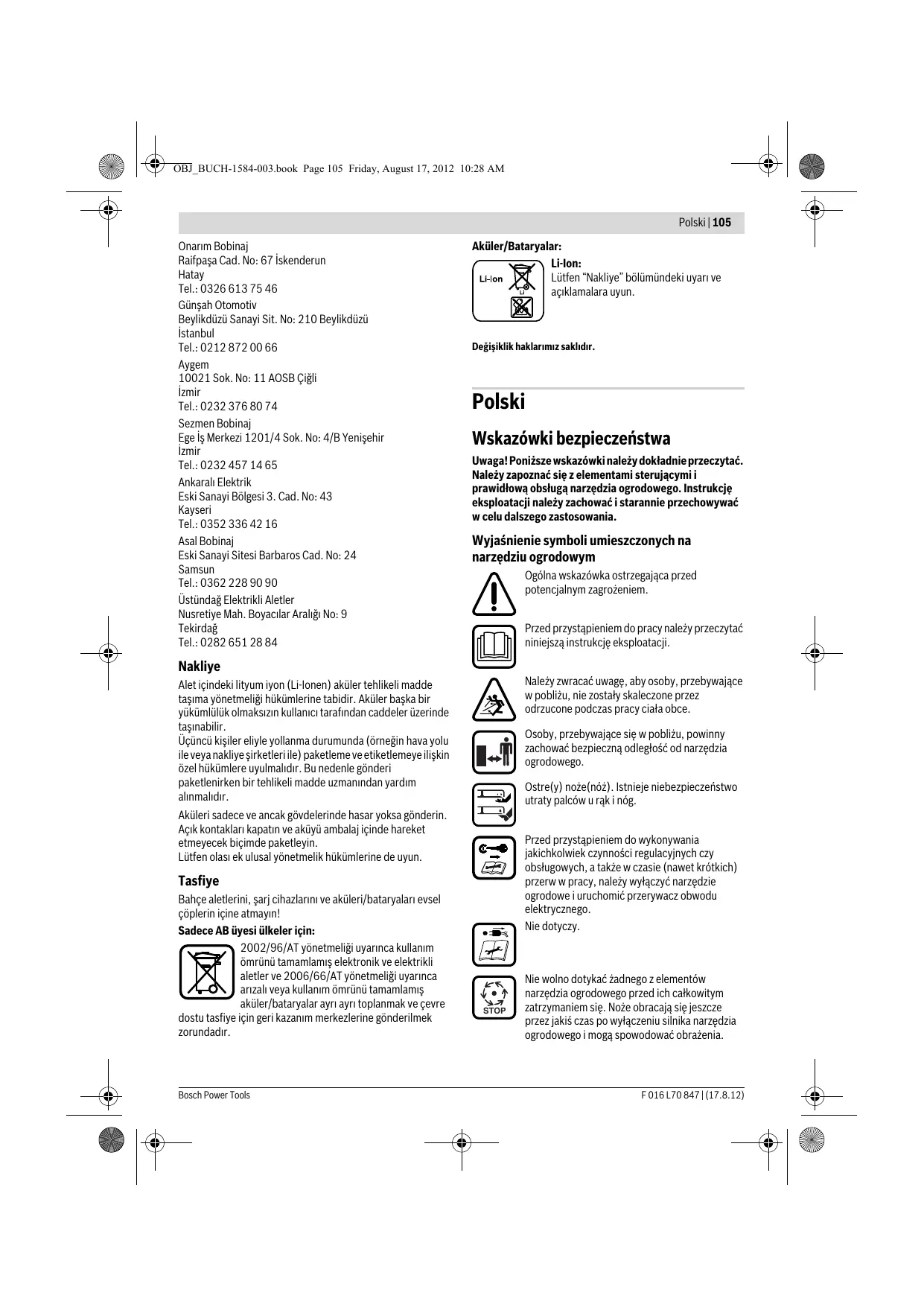 Denizli Tel.: 0258 262 06 66 Bulut Elektrik İstasyon Cad. No: 52/B Devlet Tiyatrosu Karşs Elazğ Tel.: 0424 218 35 59 Körfez Elektrik Sanayi Çarşs 770 Sok. No: 71 Erzincan Tel.: 0446 223 09 59 Ege Elektrik İnönü Bulvaro No: 135 Muğla Makasaras Fethiye Fethiye Tel.: 0252 614 57 01 Değer İş Bobinaj İsmetpaşa Mah. İlk Belediye Başkan Cad. 5/C Şahinbey Gaziantep Tel.: 0342 231 64 32 Çözüm Bobinaj İsmetpaşa Mah. Eski Şahinbey Belediyesi alt Cad. No: 3/C Gaziantep Tel.: 0342 231 95 00 Bosch Power Tools OBJ_BUCH-1584-003.book Page 105 Friday, August 17, 2012 10:28 AM Polski | 105 Onarm Bobinaj Raifpaşa Cad. No: 67 İskenderun Hatay Tel.: 0326 613 75 46 Günşah Otomotiv Beylikdüzü Sanayi Sit. No: 210 Beylikdüzü İstanbul Tel.: 0212 872 00 66 Aygem 10021 Sok. No: 11 AOSB Çiğli İzmir Tel.: 0232 376 80 74 Sezmen Bobinaj Ege İş Merkezi 1201/4 Sok. No: 4/B Yenişehir İzmir Tel.: 0232 457 14 65 Ankaral Elektrik Eski Sanayi Bölgesi 3. Cad. No: 43 Kayseri Tel.: 0352 336 42 16 Asal Bobinaj Eski Sanayi Sitesi Barbaros Cad. No: 24 Samsun Tel.: 0362 228 90 90 Üstündağ Elektrikli Aletler Nusretiye Mah. Boyaclar Aralğ No: 9 Tekirdağ Tel.: 0282 651 28 84 Aküler/Bataryalar: Li-Ion: Lütfen “Nakliye” bölümündeki uyar ve açklamalara uyun. Değişiklik haklarmz sakldr. Polski Wskazówki bezpieczeństwa Uwaga! Poniższe wskazówki należy dokładnie przeczytać. Należy zapoznać się z elementami sterującymi i prawidłową obsługą narzędzia ogrodowego. Instrukcję eksploatacji należy zachować i starannie przechowywać w celu dalszego zastosowania. Wyjaśnienie symboli umieszczonych na narzędziu ogrodowym Ogólna wskazówka ostrzegająca przed potencjalnym zagrożeniem. Przed przystąpieniem do pracy należy przeczytać niniejszą instrukcję eksploatacji. Nakliye Należy zwracać uwagę, aby osoby, przebywające w pobliżu, nie zostały skaleczone przez odrzucone podczas pracy ciała obce. Alet içindeki lityum iyon (Li-Ionen) aküler tehlikeli madde taşma yönetmeliği hükümlerine tabidir. Aküler başka bir yükümlülük olmakszn kullanc tarafndan caddeler üzerinde taşnabilir. Üçüncü kişiler eliyle yollanma durumunda (örneğin hava yolu ile veya nakliye şirketleri ile) paketleme ve etiketlemeye ilişkin özel hükümlere uyulmaldr. Bu nedenle gönderi paketlenirken bir tehlikeli madde uzmanndan yardm alnmaldr. Osoby, przebywające się w pobliżu, powinny zachować bezpieczną odległość od narzędzia ogrodowego. Ostre(y) noże(nóż). Istnieje niebezpieczeństwo utraty palców u rąk i nóg. Aküleri sadece ve ancak gövdelerinde hasar yoksa gönderin. Açk kontaklar kapatn ve aküyü ambalaj içinde hareket etmeyecek biçimde paketleyin. Lütfen olas ek ulusal yönetmelik hükümlerine de uyun. Przed przystąpieniem do wykonywania jakichkolwiek czynności regulacyjnych czy obsługowych, a także w czasie (nawet krótkich) przerw w pracy, należy wyłączyć narzędzie ogrodowe i uruchomić przerywacz obwodu elektrycznego. Nie dotyczy. Tasfiye Bahçe aletlerini, şarj cihazlarn ve aküleri/bataryalar evsel çöplerin içine atmayn! Sadece AB üyesi ülkeler için: 2002/96/AT yönetmeliği uyarnca kullanm ömrünü tamamlamş elektronik ve elektrikli aletler ve 2006/66/AT yönetmeliği uyarnca arzal veya kullanm ömrünü tamamlamş aküler/bataryalar ayr ayr toplanmak ve çevre dostu tasfiye için geri kazanm merkezlerine gönderilmek zorundadr. Bosch Power Tools STOP Nie wolno dotykać żadnego z elementów narzędzia ogrodowego przed ich całkowitym zatrzymaniem się. Noże obracają się jeszcze przez jakiś czas po wyłączeniu silnika narzędzia ogrodowego i mogą spowodować obrażenia. F 016 L70 847 | (17.8.12) OBJ_BUCH-1584-003.book Page 106 Friday, August 17, 2012 10:28 AM 106 | Polski Nie wolno stosować narzędzia ogrodowego podczas deszczu, ani wystawiać go na działanie deszczu. Należy strzec się przed porażeniem prądem elektrycznym. Nie dotyczy. Ładowarkę należy stosować tylko w suchych pomieszczeniach. Ładowarka wyposażona została w transformator bezpieczeństwa. Obsługa urządzenia f Nie wolno udostępniać narzędzia ogrodowego do użytkowania dzieciom, a także osobom, które nie zapoznały się z niniejszymi zaleceniami. Należy zwrócić uwagę, czy w danym kraju nie istnieją przepisy, ograniczające wiek użytkownika podobnych narzędzi. Nieużywane narzędzie ogrodowe należy przechowywać w miejscu niedostępnym dla dzieci. f Niniejsze narzędzie ogrodowe nie jest dostosowane do obsługi przez osoby (łącznie z dziećmi) ograniczone fizycznie, emocjonalnie, lub psychicznie, a także przez osoby z niewystarczającym doświadczeniem i/lub niedostateczną wiedzą. Wyjątek stanowi sytuacja, w której znajdują się one pod nadzorem osoby odpowiedzialnej za ich bezpieczeństwo i otrzymują od tej osoby instrukcje dotyczące posługiwania się narzędziem ogrodowym. Dzieci powinny znajdować się pod nadzorem, a narzędzie ogrodowe zabezpieczone w taki sposób, żeby nie mogły się one nim bawić. f Nie wolno nigdy kosić trawy, jeżeli w pobliżu znajdują się osoby postronne, w szczególności dzieci lub zwierzęta domowe. f Osoba obsługująca lub użytkująca urządzenie odpowiedzialna jest za wypadki i szkody na osobie i mieniu, wyrządzone innym osobom. f Nie wolno używać narzędzia ogrodowego boso ani w odkrytym obuwiu. Podczas pracy należy zawsze zakładać stabilne obuwie robocze i długie spodnie. f Przed przystąpieniem do pracy dokładnie zbadać teren, na którym będzie użyte urządzenie i usunąć z niego wszystkie kamienie, gałęzie, druty, kości i inne przedmioty. f Przed każdym przystąpieniem do pracy należy sprawdzić stan techniczny noży, śrub i zespołów tnących pod kątem ich zużycia lub uszkodzenia. Zużyte bądź uszkodzone noże, jak i śruby, przytrzymujące noże należy wymieniać całymi zestawami dla zachowania prawidłowego wyważenia. F 016 L70 847 | (17.8.12) 