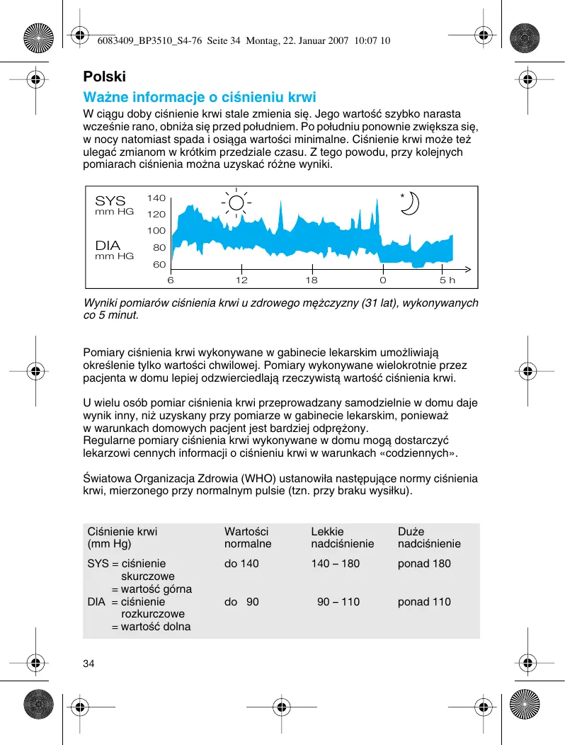 6083409_BP3510_S4-76 Seite 34 Montag, 22. Januar 2007 10:07 10 Polski Wa˝ne informacje o ciÊnieniu krwi W ciàgu doby ciÊnienie krwi stale zmienia si´. Jego wartoÊç szybko narasta wczeÊnie rano, obni˝a si´ przed po∏udniem. Po po∏udniu ponownie zwi´ksza si´, w nocy natomiast spada i osiàga wartoÊci minimalne. CiÊnienie krwi mo˝e te˝ ulegaç zmianom w krótkim przedziale czasu. Z tego powodu, przy kolejnych pomiarach ciÊnienia mo˝na uzyskaç ró˝ne wyniki. SYS