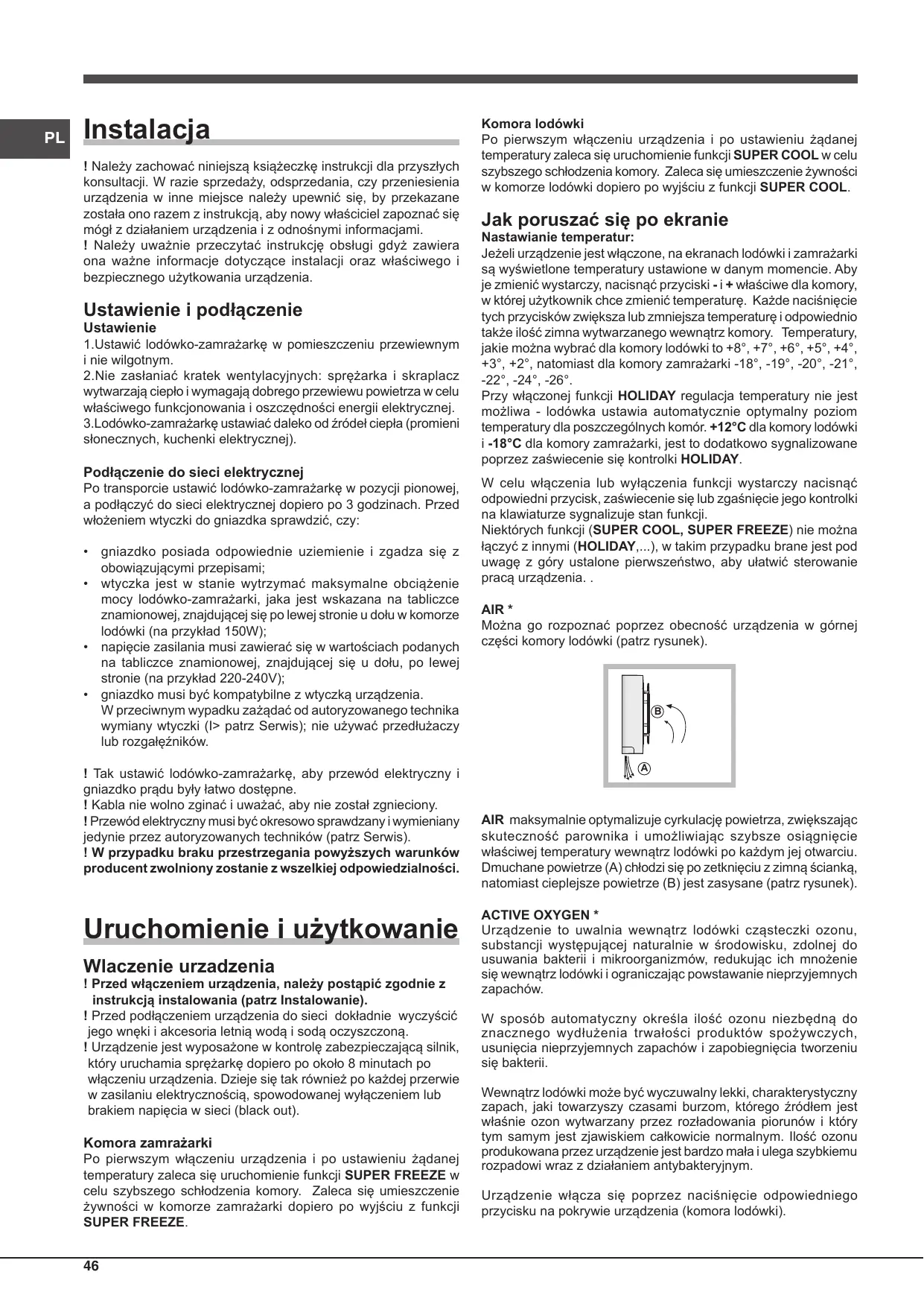 B A AIR maksymalnie optymalizuje cyrkulację powietrza, zwiększając skuteczność parownika i umożliwiając szybsze osiągnięcie właściwej temperatury wewnątrz lodówki po każdym jej otwarciu. Dmuchane powietrze (A) chłodzi się po zetknięciu z zimną ścianką, natomiast cieplejsze powietrze (B) jest zasysane (patrz rysunek). ACTIVE OXYGEN * Urządzenie to uwalnia wewnątrz lodówki cząsteczki ozonu, substancji występującej naturalnie w środowisku, zdolnej do usuwania bakterii i mikroorganizmów, redukując ich mnożenie się wewnątrz lodówki i ograniczając powstawanie nieprzyjemnych zapachów. W sposób automatyczny określa ilość ozonu niezbędną do znacznego wydłużenia trwałości produktów spożywczych, usunięcia nieprzyjemnych zapachów i zapobiegnięcia tworzeniu się bakterii. Wewnątrz lodówki może być wyczuwalny lekki, charakterystyczny zapach, jaki towarzyszy czasami burzom, którego źródłem jest właśnie ozon wytwarzany przez rozładowania piorunów i który tym samym jest zjawiskiem całkowicie normalnym. Ilość ozonu produkowana przez urządzenie jest bardzo mała i ulega szybkiemu rozpadowi wraz z działaniem antybakteryjnym. Urządzenie włącza się poprzez naciśnięcie odpowiedniego przycisku na pokrywie urządzenia (komora lodówki).