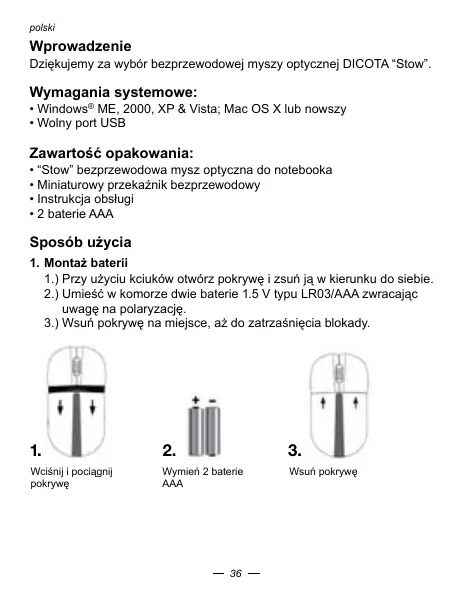 1.) Podlacz przykażnik do wolnégo portu USB komputera. Funkcjja Plug & Play zapewni automatyczna instalacje urzadzenia. Mysz nie;będzie funkcjonować.