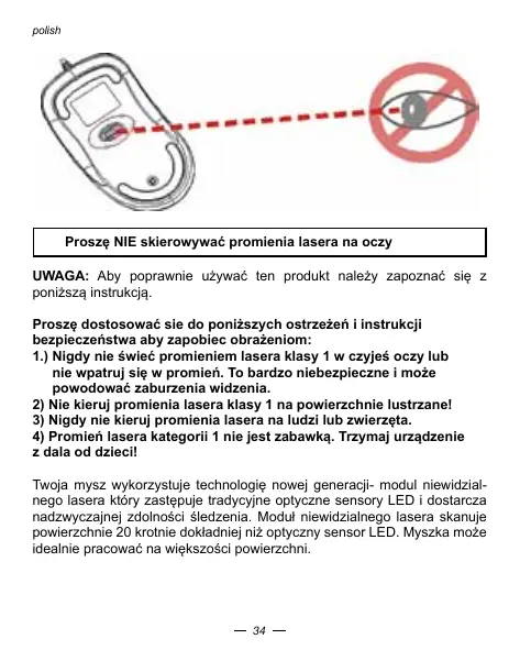 Uwaga: Czasami moga powstawac zaklocenia czujnika myszy jestli uzywana jest powierzchnia koloru czerwnego, przyrozczysta jak szklo lub hardzo mocno obdobjajaść wiaty jak lustro. Staraj sie uzywac podkladek pod mysz lub uzywac myszy na inniej powierzchni.