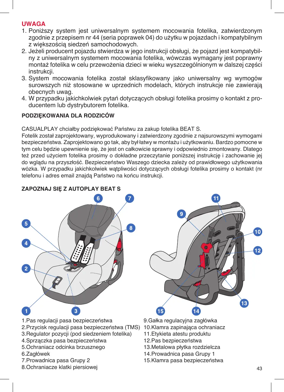 surowszych niż stosowane w uprzednich modelach, których instrukcje nie zawierają obecnych uwag. 4. W przypadku jakichkolwiek pytań dotyczących obsługi fotelika prosimy o kontakt z producentem lub dystrybutorem fotelika. Podziękowania dla rodziców CASUALPLAY chciałby podziękować Państwu za zakup fotelika BEAT S. Fotelik został zaprojektowany, wyprodukowany i zatwierdzony zgodnie z najsurowszymi wymogami bezpieczeństwa. Zaprojektowano go tak, aby był łatwy w montażu i użytkowaniu. Bardzo pomocne w tym celu będzie upewnienie się, że jest on całkowicie sprawny i odpowiednio zmontowany. Dlatego też przed użyciem fotelika prosimy o dokładne przeczytanie poniższej instrukcję i zachowanie jej do wglądu na przyszłość. Bezpieczeństwo Waszego dziecka zależy od prawidłowego użytkowania wózka. W przypadku jakichkolwiek wątpliwości dotyczących obsługi fotelika prosimy o kontakt (nr telefonu i adres email znajdą Państwo na końcu instrukcji.