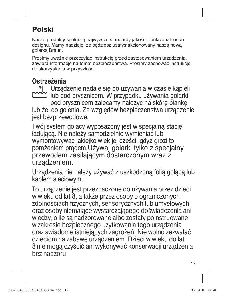 Polski Nasze produkty spełniają najwyższe standardy jakości, funkcjonalności i designu. Mamy nadzieję, ze będziesz usatysfakcjonowany naszą nową golarką Braun. Prosimy uważnie przeczytać instrukcję przed zastosowaniem urządzenia, zawiera informacje na temat bezpieczeństwa. Prosimy zachować instrukcję do skorzystania w przyszłości. Ostrzeżenia Urządzenie nadaje się do używania w czasie kąpieli lub pod prysznicem. W przypadku używania golarki pod prysznicem zalecamy nałożyć na skórę piankę lub żel do golenia. Ze względów bezpieczeństwa urządzenie jest bezprzewodowe. Twój system golący wyposażony jest w specjalną stację ładującą. Nie należy samodzielnie wymieniać lub wymontowywać jakiejkolwiek jej części, gdyż grozi to porażeniem prądem.Używaj golarki tylko z specjalny przewodem zasilającym dostarczonym wraz z urządzeniem. Urządzenia nie należy używać z uszkodzoną folią golącą lub kablem sieciowym. To urządzenie jest przeznaczone do używania przez dzieci w wieku od lat 8, a także przez osoby o ograniczonych zdolnościach fizycznych, sensorycznych lub umysłowych oraz osoby niemające wystarczającego doświadczenia ani wiedzy, o ile są nadzorowane albo zostały poinstruowane w zakresie bezpiecznego użytkowania tego urządzenia oraz świadome istniejących zagrożeń. Nie wolno zezwalać dzieciom na zabawę urządzeniem. Dzieci w wieku do lat 8 nie mogą czyścić ani wykonywać konserwacji urządzenia bez nadzoru.