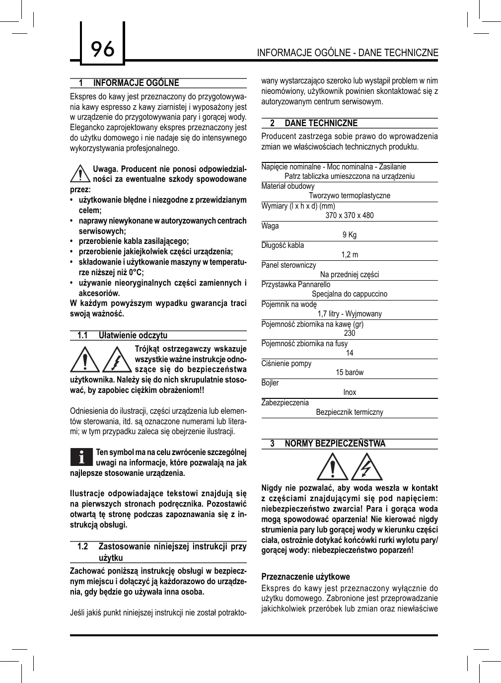 Zasilanie elektryczne Podłączyć ekspres do kawy jedynie do odpowiedniego gniazdka elektrycznego. Napięcie musi odpowiadać napięciu podanemu na tabliczce umieszczonej na urządzeniu. Kabel zasilania Nie używać nigdy ekspresu do kawy, jeśli kabel zasilania jest wadliwy. Gdy kabel zasilający jest uszkodzony, musi być wymieniony przez producenta lub przez upoważniony serwis obsługi klientów. Nie przeprowadzać kabla zasilającego przez kąty lub ostre krawędzie, nad gorącymi przedmiotami i chronić go od oleju. Nie przesuwać i nie ciągnąć ekspresu do kawy, trzymając go za kabel. Nie wyciągać wtyczki z gniazdka, ciągnąc za kabel i nie dotykać jej mokrymi rękami. Unikać swobodnego zwisania kabla zasilającego ze stołów czy półek. Ochrona osób Nie pozostawiać dzieci bez opieki, aby uniknąć by bawiły się urządzeniem. Dzieci nie zdają sobie sprawy z zagrożeń powodowanych przez sprzęt domowego użytku. Nie zostawiać ma- teriałów użytych do opakowania urządzenia w zasięgu dzieci. Niebezpieczeństwo poparzeń Unikać kierowania strumienia pary i/lub gorącej wody w swoją stronę lub w kierunku innych osób: niebezpieczeństwo poparzeń! Używać zawsze przeznaczone do tego celu uchwyty lub pokrętła. Usytuowanie Umieścić ekspres do kawy w bezpiecznym miejscu, gdzie nikt nie będzie mógł go przewrócić czy zostać zraniony przez jego części. Możliwość wydostania się gorącej wody i pary: niebezpieczeństwo poparzeń! Nie trzymać urządzenia w temperaturze niższej niż 0°C; istnieje niebezpieczeństwo uszkodzenia urządzenia przez lód. Nie używać ekspresu do kawy na świeżym powietrzu. Nie umieszczać urządzenia w pobliżu bardzo rozgrzanych powierzchni ani otwartego ognia, obudowa mogłaby się stopić lub zostać uszkodzona. Czyszczenie Przed czyszczeniem urządzenia, należy je wyłączyć przy pomocy przycisku ON/OFF i wyciągnąć następnie wtyczkę z gniazdka elektrycznego. Ponadto odczekać, aż urządzenie się ochłodzi. Nie zanurzać nigdy urządzenia w wodzie! Surowo zabrania się przeprowadzania interwencji wewnątrz urządzenia. Nie używać do celów spożywczych wody pozostałej w pojemniku przez kilka dni, umyć pojemnik i napełnić go świeżą, pitną wodą. Miejsce przeznaczone do użytku i konserwacji Dla uzyskania poprawnego funkcjonowania ekspresu do kawy, zaleca się przestrzeganie następujących warunków: