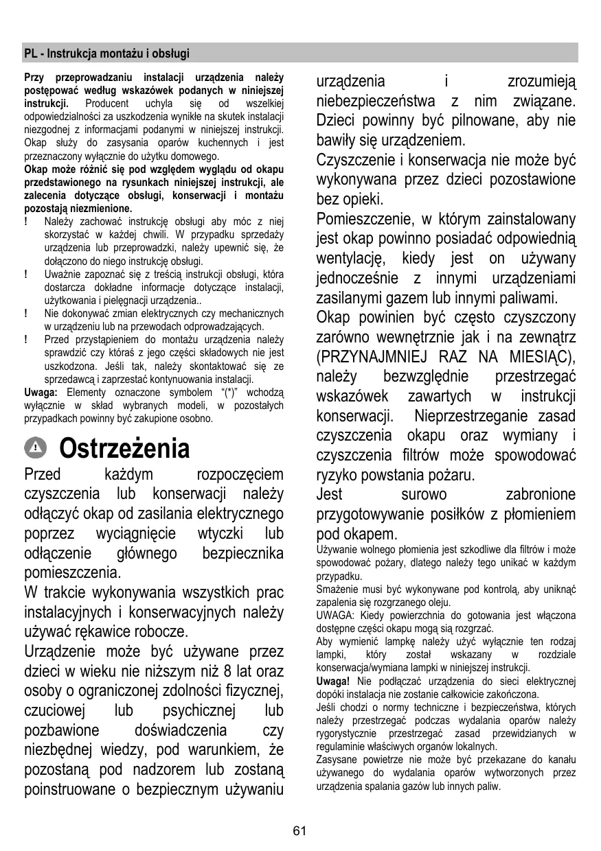 PL - Instrukcja montażu i obsługi Przy przeprowadzaniu instalacji urządzenia należy postępować według wskazówek podanych w niniejszej instrukcji. Producent uchyla się od wszelkiej odpowiedzialności za uszkodzenia wynikłe na skutek instalacji niezgodnej z informacjami podanymi w niniejszej instrukcji. Okap służy do zasysania oparów kuchennych i jest przeznaczony wyłącznie do użytku domowego. Okap może różnić się pod względem wyglądu od okapu przedstawionego na rysunkach niniejszej instrukcji, ale zalecenia dotyczące obsługi, konserwacji i montażu pozostają niezmienione. Należy zachować instrukcję obsługi aby móc z niej skorzystać w każdej chwili. W przypadku sprzedaży urządzenia lub przeprowadzki, należy upewnić się, że dołączono do niego instrukcję obsługi. Uważnie zapoznać się z treścią instrukcji obsługi, która dostarcza dokładne informacje dotyczące instalacji, użytkowania i pielęgnacji urządzenia.. Nie dokonywać zmian elektrycznych czy mechanicznych w urządzeniu lub na przewodach odprowadzających. Przed przystąpieniem do montażu urządzenia należy sprawdzić czy któraś z jego części składowych nie jest uszkodzona. Jeśli tak, należy skontaktować się ze sprzedawcą i zaprzestać kontynuowania instalacji. Uwaga: Elementy oznaczone symbolem “(*)” wchodzą wyłącznie w skład wybranych modeli, w pozostałych przypadkach powinny być zakupione osobno. urządzenia zrozumieją niebezpieczeństwa z nim związane. Dzieci powinny być pilnowane, aby nie bawiły się urządzeniem. Czyszczenie i konserwacja nie może być wykonywana przez dzieci pozostawione bez opieki. Pomieszczenie, w którym zainstalowany jest okap powinno posiadać odpowiednią wentylację, kiedy jest on używany jednocześnie z innymi urządzeniami zasilanymi gazem lub innymi paliwami. Okap powinien być często czyszczony zarówno wewnętrznie jak i na zewnątrz (PRZYNAJMNIEJ RAZ NA MIESIĄC), należy bezwzględnie przestrzegać wskazówek zawartych w instrukcji konserwacji. Nieprzestrzeganie zasad czyszczenia okapu oraz wymiany i czyszczenia filtrów może spowodować ryzyko powstania pożaru. Jest surowo zabronione przygotowywanie posiłków z płomieniem pod okapem. Ostrzeżenia Przed każdym rozpoczęciem czyszczenia lub konserwacji należy odłączyć okap od zasilania elektrycznego poprzez wyciągnięcie wtyczki lub odłączenie głównego bezpiecznika pomieszczenia. W trakcie wykonywania wszystkich prac instalacyjnych i konserwacyjnych należy używać rękawice robocze. Urządzenie może być używane przez dzieci w wieku nie niższym niż 8 lat oraz osoby o ograniczonej zdolności fizycznej, czuciowej lub psychicznej lub pozbawione doświadczenia czy niezbędnej wiedzy, pod warunkiem, że pozostaną pod nadzorem lub zostaną poinstruowane o bezpiecznym używaniu Używanie wolnego płomienia jest szkodliwe dla filtrów i może spowodować pożary, dlatego należy tego unikać w każdym przypadku. Smażenie musi być wykonywane pod kontrolą, aby uniknąć zapalenia się rozgrzanego oleju. UWAGA: Kiedy powierzchnia do gotowania jest włączona dostępne części okapu mogą sią rozgrzać. Aby wymienić lampkę należy użyć wyłącznie ten rodzaj lampki, który został wskazany rozdziale konserwacja/wymiana lampki w niniejszej instrukcji. Uwaga! Nie podłączać urządzenia do sieci elektrycznej dopóki instalacja nie zostanie całkowicie zakończona. Jeśli chodzi o normy techniczne i bezpieczeństwa, których należy przestrzegać podczas wydalania oparów należy rygorystycznie przestrzegać zasad przewidzianych w regulaminie właściwych organów lokalnych. Zasysane powietrze nie może być przekazane do kanału używanego do wydalania oparów wytworzonych przez urządzenia spalania gazów lub innych paliw.