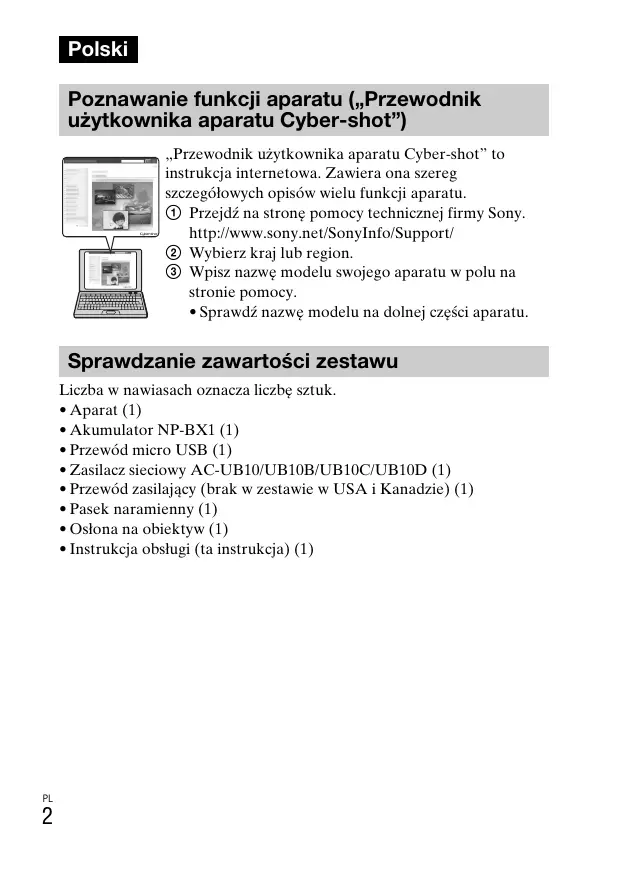 Polski Poznawanie funkcji aparatu („Przewodnik użytkownika aparatu Cyber-shot”) „Przewodnik użytkownika aparatu Cyber-shot” to instrukcja internetowa. Zawiera ona szereg szczegółowych opisów wielu funkcji aparatu. 1 Przejdź na stronę pomocy technicznej firmy Sony. http://www.sony.net/SonyInfo/Support/ 2 Wybierz kraj lub region. 3 Wpisz nazwę modelu swojego aparatu w polu na stronie pomocy.