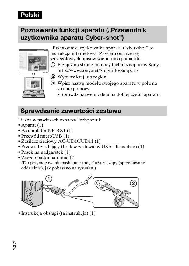 Polski Poznawanie funkcji aparatu („Przewodnik użytkownika aparatu Cyber-shot”) „Przewodnik użytkownika aparatu Cyber-shot” to instrukcja internetowa. Zawiera ona szereg szczegółowych opisów wielu funkcji aparatu. 1 Przejdź na stronę pomocy technicznej firmy Sony. http://www.sony.net/SonyInfo/Support/ 2 Wybierz kraj lub region. 3 Wpisz nazwę modelu swojego aparatu w polu na stronie pomocy.