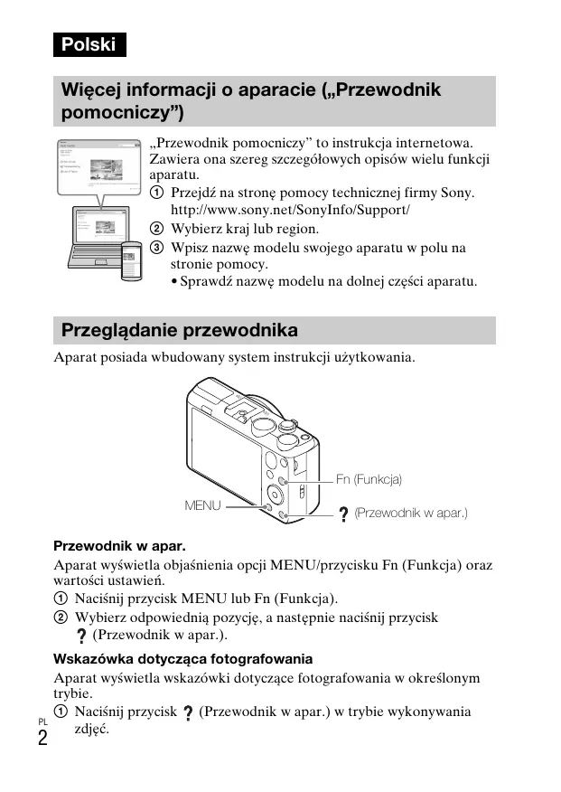 - Sprawdź nazwę modelu na dolnej części aparatu. Przeglądanie przewodnika Aparat posiada wbudowany system instrukcji użytkowania. Fn (Funkcja) MENU (Przewodnik w apar.) Przewodnik w apar. Aparat wyświetla objaśnienia opcji MENU/przycisku Fn (Funkcja) oraz wartości ustawień. 1 Naciśnij przycisk MENU lub Fn (Funkcja). 2 Wybierz odpowiednią pozycję, a następnie naciśnij przycisk (Przewodnik w apar.).