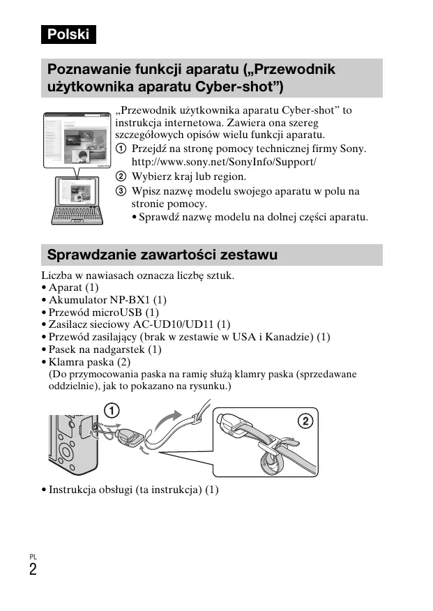 Polski Poznawanie funkcji aparatu („Przewodnik użytkownika aparatu Cyber-shot”) „Przewodnik użytkownika aparatu Cyber-shot” to instrukcja internetowa. Zawiera ona szereg szczegółowych opisów wielu funkcji aparatu. 1 Przejdź na stronę pomocy technicznej firmy Sony. http://www.sony.net/SonyInfo/Support/ 2 Wybierz kraj lub region. 3 Wpisz nazwę modelu swojego aparatu w polu na stronie pomocy.