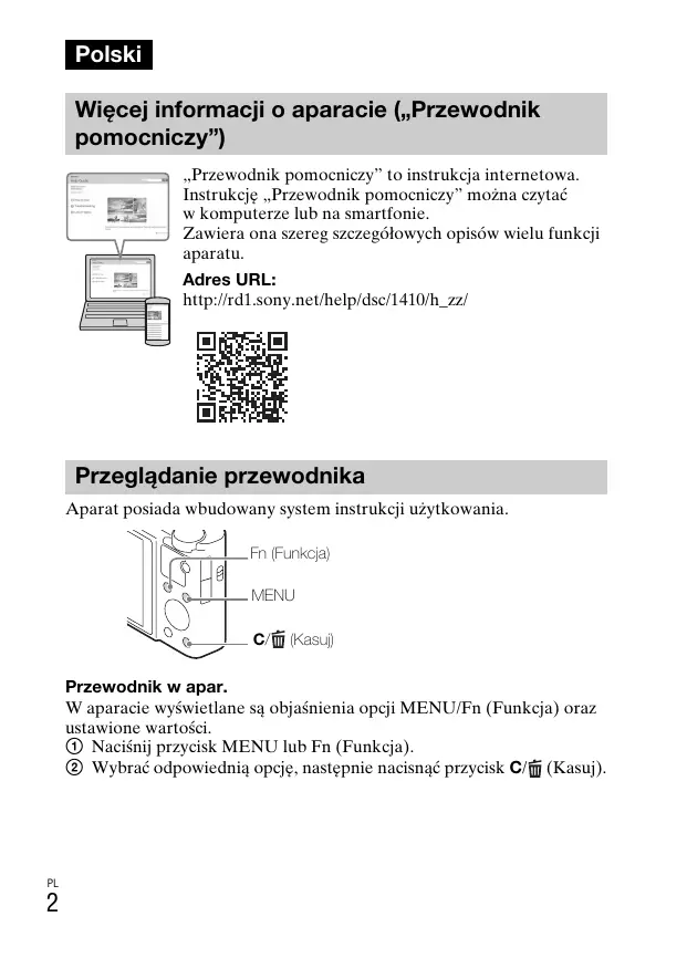 Polski Więcej informacji o aparacie („Przewodnik pomocniczy”) „Przewodnik pomocniczy” to instrukcja internetowa. Instrukcję „Przewodnik pomocniczy” można czytać w komputerze lub na smartfonie. Zawiera ona szereg szczegółowych opisów wielu funkcji aparatu. Adres URL: http://rd1.sony.net/help/dsc/1410/h_zz/ Przeglądanie przewodnika Aparat posiada wbudowany system instrukcji użytkowania. Fn (Funkcja) MENU