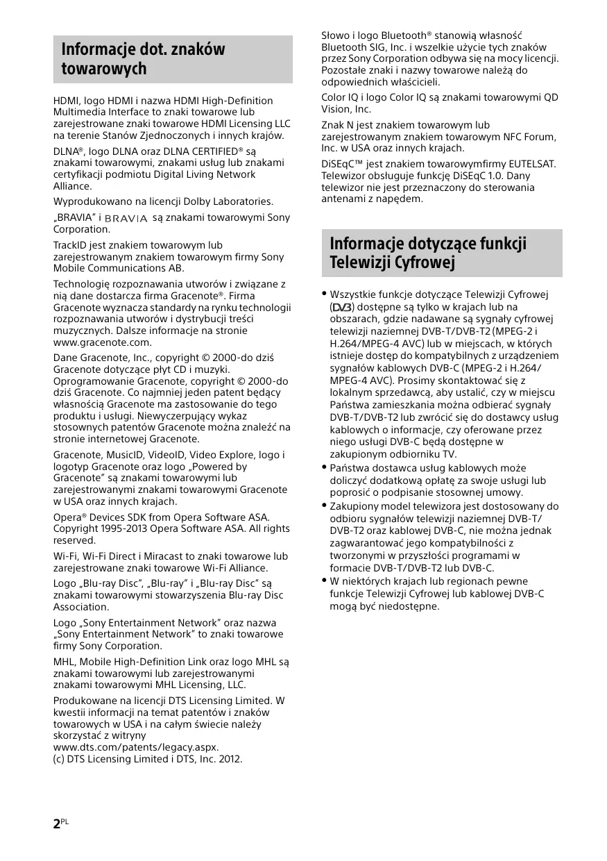 « BRAVIA » et Corporation. La technologie de reconnaissance des données audio/vidéo et les données associées sont fournies par Gracenote®. Gracenote constitue la norme de l’industrie en matière de technologie de reconnaissance musicale et de fourniture de contenus connexes. Pour plus de détails, visitez www.gracenote.com. Les données sur CD, DVD ou/et Blu-ray Disc et les données associées aux morceaux de musique et aux clips vidéo sont fournies par Gracenote, Inc., Copyright © 2000 - Date actuelle Gracenote. Logiciels Gracenote, Copyright © 2000 - Date actuelle Gracenote. Ce produit et ce service sont protégés par un ou plusieurs brevets appartenant à Gracenote. Pour obtenir une liste non exhaustive des brevets Gracenote en vigueur, visitez le site Web de Gracenote. Gracenote, MusicID, VideoID, Video Explore, le logo et le logo type Gracenote ainsi que le logo « Powered by Gracenote » sont des marques ou des marques déposées de Gracenote aux Etats-Unis et/ ou dans d’autres pays. Opera® Devices SDK from Opera Software ASA. Copyright 1995-2013 Opera Software ASA. All rights reserved. Wi-Fi, Wi-Fi Direct et Miracast sont des marques ou des marques déposées de Wi-Fi Alliance. « Blu-ray Disc », « Blu-ray » et le logo « Blu-ray Disc » sont des marques de Blu-ray Disc Association. Le logo « Sony Entertainment Network » et « Sony Entertainment Network » sont des marques de Sony Corporation. MHL, Mobile High-Definition Link et le logo MHL sont des marques ou des marques déposées de MHL Licensing, LLC. Fabriqué sous licence de DTS Licensing Limited. Pour plus d’informations sur les marques et les brevets aux Etats-Unis et à travers le monde, visitez www.dts.com/patents/legacy.aspx. (c) DTS Licensing Limited et DTS, Inc. 2012.