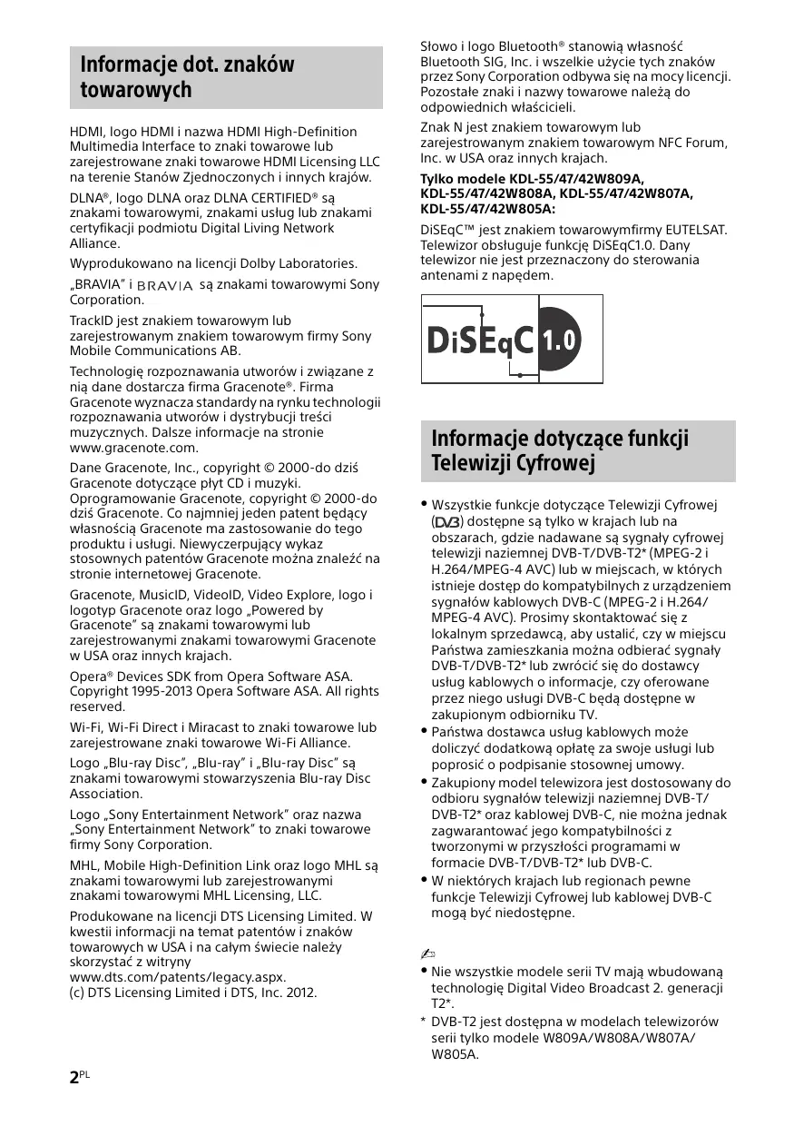 Informacje dot. znaków towarowych HDMI, logo HDMI i nazwa HDMI High-Definition Multimedia Interface to znaki towarowe lub zarejestrowane znaki towarowe HDMI Licensing LLC na terenie Stanów Zjednoczonych i innych krajów. DLNA®, logo DLNA oraz DLNA CERTIFIED® są znakami towarowymi, znakami usług lub znakami certyfikacji podmiotu Digital Living Network Alliance. Wyprodukowano na licencji Dolby Laboratories. „BRAVIA” i Corporation. są znakami towarowymi Sony Słowo i logo Bluetooth® stanowią własność Bluetooth SIG, Inc. i wszelkie użycie tych znaków przez Sony Corporation odbywa się na mocy licencji. Pozostałe znaki i nazwy towarowe należą do odpowiednich właścicieli. Znak N jest znakiem towarowym lub zarejestrowanym znakiem towarowym NFC Forum, Inc. w USA oraz innych krajach. Tylko modele KDL-55/47/42W809A, KDL-55/47/42W808A, KDL-55/47/42W807A, KDL-55/47/42W805A: DiSEqC™ jest znakiem towarowymfirmy EUTELSAT. Telewizor obsługuje funkcję DiSEqC1.0. Dany telewizor nie jest przeznaczony do sterowania antenami z napędem. TrackID jest znakiem towarowym lub zarejestrowanym znakiem towarowym firmy Sony Mobile Communications AB. Technologię rozpoznawania utworów i związane z nią dane dostarcza firma Gracenote®. Firma Gracenote wyznacza standardy na rynku technologii rozpoznawania utworów i dystrybucji treści muzycznych. Dalsze informacje na stronie www.gracenote.com. Dane Gracenote, Inc., copyright © 2000-do dziś Gracenote dotyczące płyt CD i muzyki. Oprogramowanie Gracenote, copyright © 2000-do dziś Gracenote. Co najmniej jeden patent będący własnością Gracenote ma zastosowanie do tego produktu i usługi. Niewyczerpujący wykaz stosownych patentów Gracenote można znaleźć na stronie internetowej Gracenote. Gracenote, MusicID, VideoID, Video Explore, logo i logotyp Gracenote oraz logo „Powered by Gracenote” są znakami towarowymi lub zarejestrowanymi znakami towarowymi Gracenote w USA oraz innych krajach. Opera® Devices SDK from Opera Software ASA. Copyright 1995-2013 Opera Software ASA. All rights reserved. Wi-Fi, Wi-Fi Direct i Miracast to znaki towarowe lub zarejestrowane znaki towarowe Wi-Fi Alliance. Logo „Blu-ray Disc”, „Blu-ray” i „Blu-ray Disc” są znakami towarowymi stowarzyszenia Blu-ray Disc Association. Logo „Sony Entertainment Network” oraz nazwa „Sony Entertainment Network” to znaki towarowe firmy Sony Corporation. MHL, Mobile High-Definition Link oraz logo MHL są znakami towarowymi lub zarejestrowanymi znakami towarowymi MHL Licensing, LLC. Produkowane na licencji DTS Licensing Limited. W kwestii informacji na temat patentów i znaków towarowych w USA i na całym świecie należy skorzystać z witryny www.dts.com/patents/legacy.aspx. (c) DTS Licensing Limited i DTS, Inc. 2012. 2PL Informacje dotyczące funkcji Telewizji Cyfrowej Wszystkie funkcje dotyczące Telewizji Cyfrowej ) dostępne są tylko w krajach lub na obszarach, gdzie nadawane są sygnały cyfrowej telewizji naziemnej DVB-T/DVB-T2* (MPEG-2 i H.264/MPEG-4 AVC) lub w miejscach, w których istnieje dostęp do kompatybilnych z urządzeniem sygnałów kablowych DVB-C (MPEG-2 i H.264/ MPEG-4 AVC). Prosimy skontaktować się z lokalnym sprzedawcą, aby ustalić, czy w miejscu Państwa zamieszkania można odbierać sygnały DVB-T/DVB-T2* lub zwrócić się do dostawcy usług kablowych o informacje, czy oferowane przez niego usługi DVB-C będą dostępne w zakupionym odbiorniku TV. Państwa dostawca usług kablowych może doliczyć dodatkową opłatę za swoje usługi lub poprosić o podpisanie stosownej umowy. Zakupiony model telewizora jest dostosowany do odbioru sygnałów telewizji naziemnej DVB-T/ DVB-T2* oraz kablowej DVB-C, nie można jednak zagwarantować jego kompatybilności z tworzonymi w przyszłości programami w formacie DVB-T/DVB-T2* lub DVB-C. W niektórych krajach lub regionach pewne funkcje Telewizji Cyfrowej lub kablowej DVB-C mogą być niedostępne. Nie wszystkie modele serii TV mają wbudowaną technologię Digital Video Broadcast 2. generacji T2*.