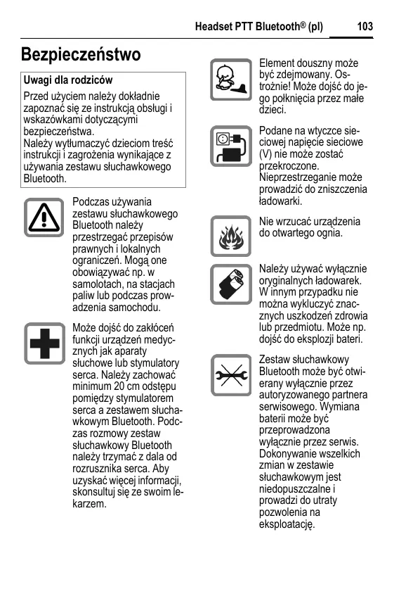 Element douszny może być zdejmowany. Ostrożnie! Może dojść do jego połknięcia przez małe dzieci. Podane na wtyczce sieciowej napięcie sieciowe (V) nie może zostać przekroczone. Nieprzestrzeganie może prowadzić do zniszczenia ładowarki. Nie wrzucać urządzenia do otwartego ognia. Należy używać wyłącznie oryginalnych ładowarek. W innym przypadku nie można wykluczyć znacznych uszkodzeń zdrowia lub przedmiotu. Może np. dojść do eksplozji bateri. Zestaw słuchawkowy Bluetooth może być otwierany wyłącznie przez autoryzowanego partnera serwisowego. Wymiana baterii może być przeprowadzona wyłącznie przez serwis. Dokonywanie wszelkich zmian w zestawie słuchawkowym jest niedopuszczalne i prowadzi do utraty pozwolenia na eksploatację.