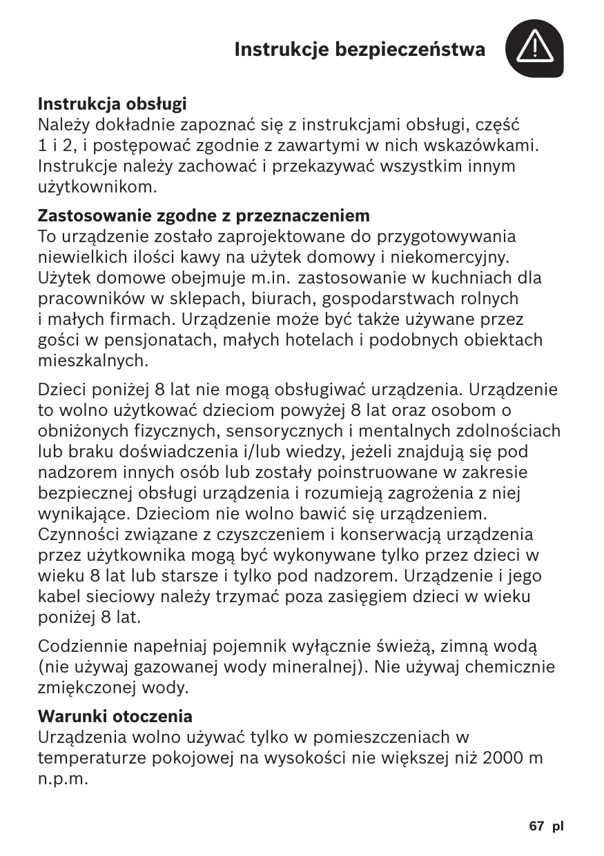 A Instrukcja obsługi Należy dokładnie zapoznać się z instrukcjami obsługi, część 1 i 2, i postępować zgodnie z zawartymi w nich wskazówkami. Instrukcje należy zachować i przekazywać wszystkim innym użytkownikom. Zastosowanie zgodne z przeznaczeniem To urządzenie zostało zaprojektowane do przygotowywania niewielkich ilości kawy na użytek domowy i niekomercyjny. Użytek domowe obejmuje m.in. zastosowanie w kuchniach dla pracowników w sklepach, biurach, gospodarstwach rolnych i małych firmach. Urządzenie może być także używane przez gości w pensjonatach, małych hotelach i podobnych obiektach mieszkalnych. Dzieci poniżej 8 lat nie mogą obsługiwać urządzenia. Urządzenie to wolno użytkować dzieciom powyżej 8 lat oraz osobom o obniżonych fizycznych, sensorycznych i mentalnych zdolnościach lub braku doświadczenia i/lub wiedzy, jeżeli znajdują się pod nadzorem innych osób lub zostały poinstruowane w zakresie bezpiecznej obsługi urządzenia i rozumieją zagrożenia z niej wynikające. Dzieciom nie wolno bawić się urządzeniem. Czynności związane z czyszczeniem i konserwacją urządzenia przez użytkownika mogą być wykonywane tylko przez dzieci w wieku 8 lat lub starsze i tylko pod nadzorem. Urządzenie i jego kabel sieciowy należy trzymać poza zasięgiem dzieci w wieku poniżej 8 lat. Codziennie napełniaj pojemnik wyłącznie świeżą, zimną wodą (nie używaj gazowanej wody mineralnej). Nie używaj chemicznie zmiękczonej wody. Warunki otoczenia Urządzenia wolno używać tylko w pomieszczeniach w temperaturze pokojowej na wysokości nie większej niż 2000 m n.p.m. 67 pl