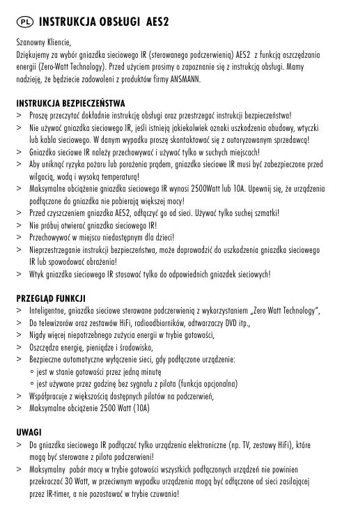 > Proszę przeczytać dokładnie instrukcję obsługi oraz przestrzegać instrukcji bezpieczeństwa! > Nie używać gniazdka sieciowego IR, jeśli istnieją jakiekolwiek oznaki uszkodzenia obudowy, wtyczki lub kabla sieciowego. W danym wypadku proszę skontaktować się z autoryzowanym sprzedawcą! > Gniazdko sieciowe IR należy przechowywać i używać tylko w suchych miejscach! > Aby uniknąć ryzyka pożaru lub porażenia prądem, gniazdko sieciowe IR musi być zabezpieczone przed wilgocią, wodą i wysoką temperaturą! > Maksymalne obciążenie gniazdka sieciowego IR wynosi 2500Watt lub 10A. Upewnij się, że urządzenia podłączone do gniazdka nie pobierają większej mocy! > Przed czyszczeniem gniazdka AES2, odłączyć go od sieci. Używać tylko suchej szmatki! > Nie próbuj otwierać gniazdka sieciowego IR! > Przechowywać w miejscu niedostępnym dla dzieci! > Nieprzestrzeganie instrukcji bezpieczeństwa, może doprowadzić do uszkodzenia gniazdka sieciowego IR lub spowodować obrażenia! > Wtyk gniazdka sieciowego IR stosować tylko do odpowiednich gniazdek sieciowych!