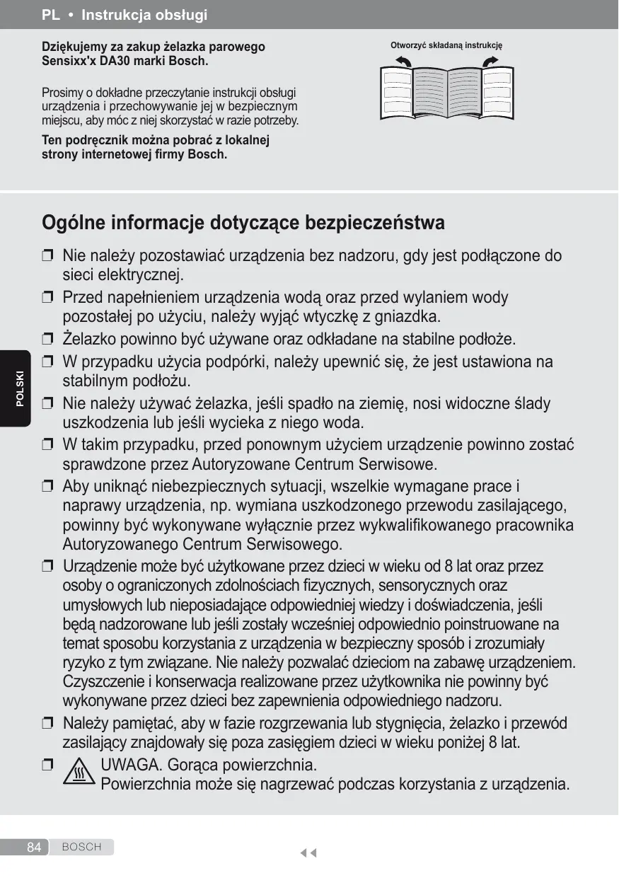 Dziekujemy za zakup Zelazka parowego Otworzyé skladana instrukcje Sensixx'x DA30 marki Bosch.