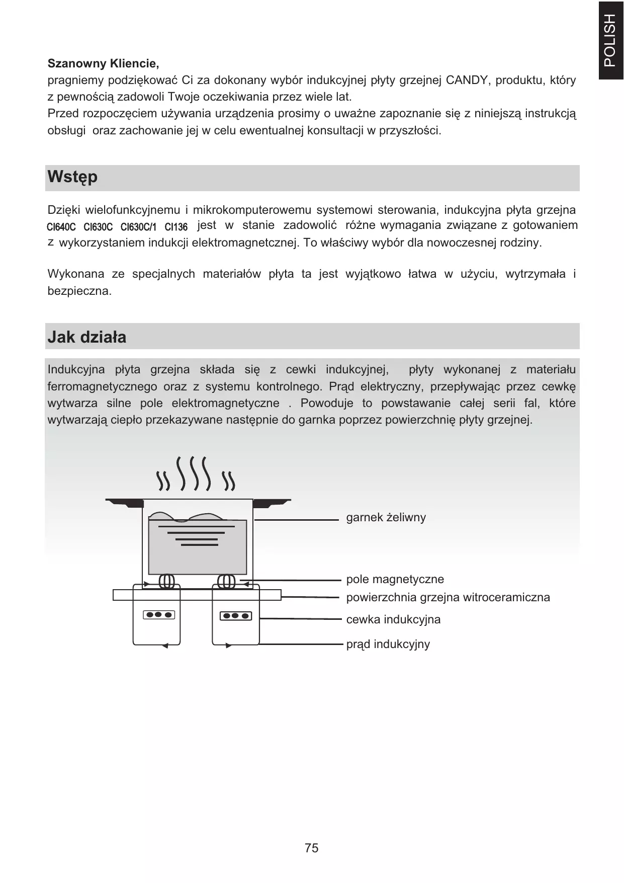 POLISH Szanowny Kliencie, pragniemy podziĊkowaü Ci za dokonany wybór indukcyjnej páyty grzejnej CANDY, produktu, który z pewnoĞcią zadowoli Twoje oczekiwania przez wiele lat. Przed rozpoczĊciem uĪywania urządzenia prosimy o uwaĪne zapoznanie siĊ z niniejszą instrukcją obsáugi oraz zachowanie jej w celu ewentualnej konsultacji w przyszáoĞci. BezpieczeĔstwo Instalacja Niniejsza páyta grzejna przeznaczona jest do uĪytku domowego. Staramy siĊ stale doskonaliü nasze produkty i dlatego zastrzegamy sobie prawo dokonywania zmian w przypadku ewentualnych postĊpów w technice. MontaĪ urządzenia
