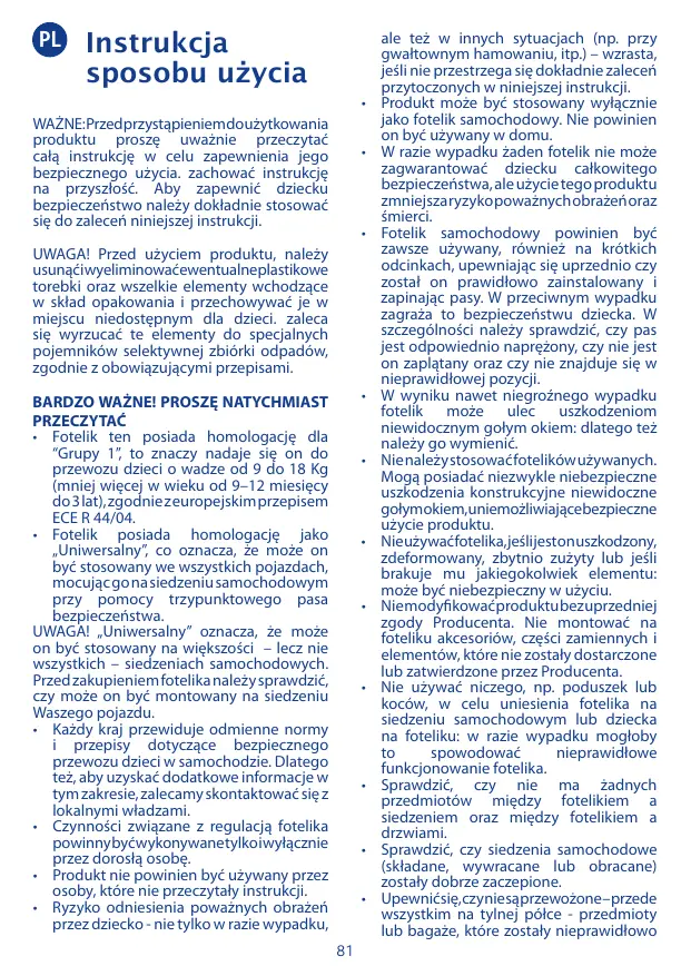 • No permita que nadie utilice el producto sin haber leído las instrucciones. • Si no se siguen exactamente las instrucciones de este manual aumenta el riesgo de daños graves para el niño, no sólo en caso de accidente sino también en otras situaciones (por ej. frenadas bruscas, etc.). • Este producto debe ser utilizado exclusivamente como sillita de automóvil; no utili28
