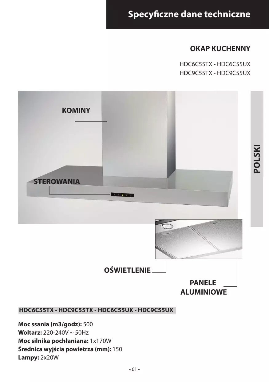 OKAP KUCHENNY HDC6C55TX - HDC6C55UX HDC9C55TX - HDC9C55UX POLSKI KOMINY STEROWANIA OŚWIETLENIE PANELE ALUMINIOWE HDC6C55TX - HDC9C55TX - HDC6C55UX - HDC9C55UX Moc ssania (m3/godz): 500 Woltarz: 220-240V ~ 50Hz Moc silnika pochłaniana: 1x170W Średnica wyjścia powietrza (mm): 150 Lampy: 2x20W - 61 -