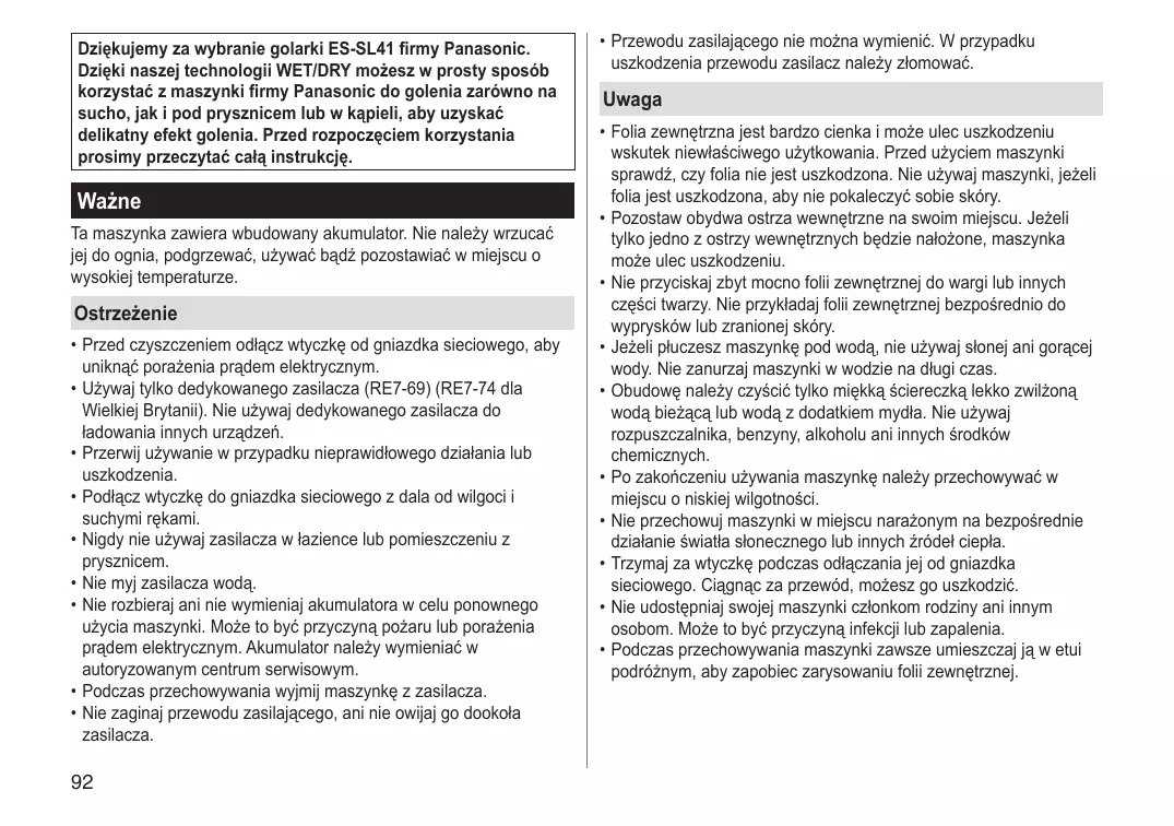 Dziękujemy za wybranie golarki ES‑SL41 firmy Panasonic. Dzięki naszej technologii WET/DRY możesz w prosty sposób korzystać z maszynki firmy Panasonic do golenia zarówno na sucho, jak i pod prysznicem lub w kąpieli, aby uzyskać delikatny efekt golenia. Przed rozpoczęciem korzystania prosimy przeczytać całą instrukcję.