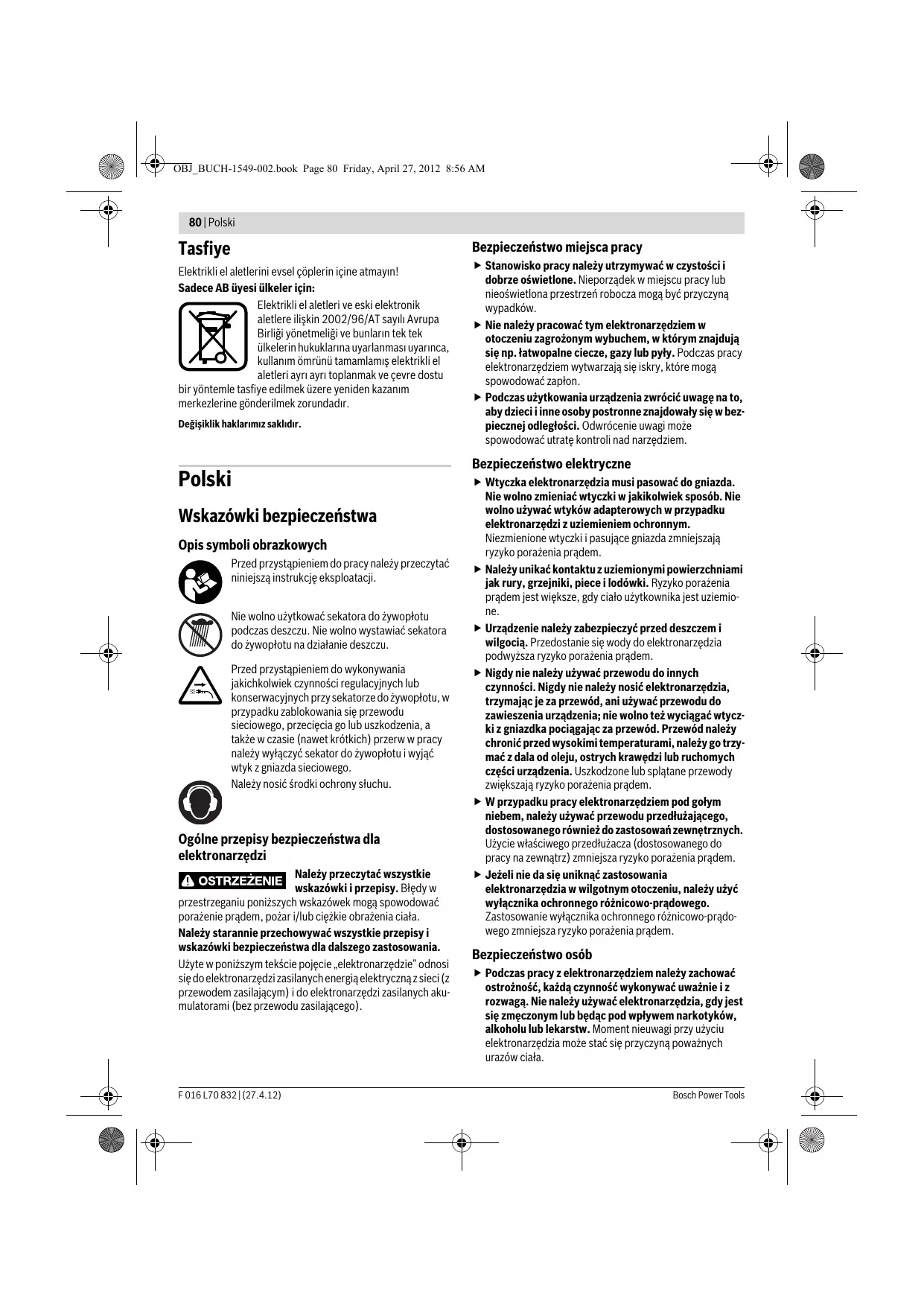 Podany w niniejszej instrukcji poziom drgań pomierzony został zgodnie z określoną przez normę EN 60745 procedurą pomiarową i może zostać użyty do porównywania elektronarzędzi. Można go też użyć do wstępnej oceny ekspozycji na drgania. F 016 L70 832 | (27.4.12)