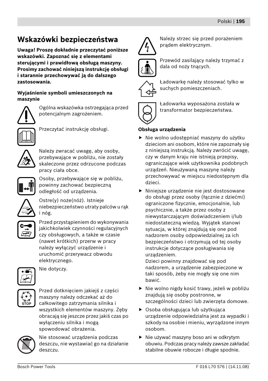 Uwaga! Proszę dokładnie przeczytać poniższe wskazówki. Zapoznać się z elementami sterującymi i prawidłową obsługą maszyny. Prosimy zachować niniejszą instrukcję obsługi i starannie przechowywać ją do dalszego zastosowania. Wyjaśnienie symboli umieszczonych na maszynie Ogólna wskazówka ostrzegająca przed potencjalnym zagrożeniem. Przewód zasilający należy trzymać z dala od noży tnących. Ładowarkę należy stosować tylko w suchych pomieszczeniach. Ładowarka wyposażona została w transformator bezpieczeństwa. Przeczytać instrukcję obsługi. Obsługa urządzenia Należy zwracać uwagę, aby osoby, przebywające w pobliżu, nie zostały skaleczone przez odrzucone podczas pracy ciała obce. f Nie wolno udostępniać maszyny do użytku dzieciom ani osobom, które nie zapoznały się z niniejszą instrukcją. Należy zwrócić uwagę, czy w danym kraju nie istnieją przepisy, ograniczające wiek użytkownika podobnych urządzeń. Nieużywaną maszynę należy przechowywać w miejscu niedostępnym dla dzieci. Osoby, przebywające się w pobliżu, powinny zachować bezpieczną odległość od urządzenia. Ostre(y) noże(nóż). Istnieje niebezpieczeństwo utraty palców u rąk i nóg. Przed przystąpieniem do wykonywania jakichkolwiek czynności regulacyjnych czy obsługowych, a także w czasie (nawet krótkich) przerw w pracy należy wyłączyć urządzenie i uruchomić przerywacz obwodu elektrycznego. Nie dotyczy. STOP Należy strzec się przed porażeniem prądem elektrycznym. Przed dotknięciem jakiejś z części maszyny należy odczekać aż do całkowitego zatrzymania silnika i wszystkich elementów maszyny. Zęby obracają się jeszcze przez jakiś czas po wyłączeniu silnika i mogą spowodować obrażenia. Nie stosować urządzenia podczas deszczu, nie wystawiać go na działanie deszczu. Bosch Power Tools f Niniejsze urządzenie nie jest dostosowane do obsługi przez osoby (łącznie z dziećmi) ograniczone fizycznie, emocjonalnie, lub psychicznie, a także przez osoby z niewystarczającym doświadczeniem i/lub niedostateczną wiedzą. Wyjątek stanowi sytuacja, w której znajdują się one pod nadzorem osoby odpowiedzialnej za ich bezpieczeństwo i otrzymują od tej osoby instrukcje dotyczące posługiwania się urządzeniem. Dzieci powinny znajdować się pod nadzorem, a urządzenie zabezpieczone w taki sposób, żeby nie mogły się one nim bawić. f Nie wolno nigdy kosić trawy, jeżeli w pobliżu znajdują się osoby postronne, w szczególności dzieci lub zwierzęta domowe. f Osoba obsługująca lub użytkująca urządzenie odpowiedzialna jest za wypadki i szkody na osobie i mieniu, wyrządzone innym osobom. f Nie używać maszyny boso ani w odkrytym obuwiu. Podczas pracy należy zawsze zakładać stabilne obuwie robocze i długie spodnie. F 016 L70 576 | (14.11.08) 196 | Polski f Przed przystąpieniem do pracy dokładnie zbadać teren, na którym będzie użyte urządzenie i usunąć z niego wszystkie kamienie, gałęzie, druty, kości i inne przedmioty. f Przed każdym przystąpieniem do pracy należy sprawdzić stan techniczny noży, śrub i zespołów tnących pod kątem ich zużycia lub uszkodzenia. Zużyte bądź uszkodzone noże, jak i śruby, przytrzymujące noże należy wymieniać całymi zestawami dla zachowania prawidłowego wyważenia. f Pracować tylko w ciągu dnia lub przy dobrym sztucznym oświetleniu. f W miarę możliwości unikać koszenia mokrej trawy. f Podczas pracy należy iść spokojnym krokiem, nie wolno w żadnym wypadku biec. f Nie wolno eksploatować maszyny, jeżeli urządzenia zabezpieczające i pokrywy są uszkodzone, lub gdy zabezpieczenia takie jak na przykład osłona i/lub kosz zbierający trawę nie są zamontowane. f Praca na terenie o dużym nachyleniu może być niebezpieczna. – Nie wolno kosić na zbyt stromych zboczach. – Na pochyłych powierzchniach lub wilgotnej trawie należy pracować ostrożnie, aby nie stracić równowagi. – Urządzenie prowadzić należy tylko w poprzek zbocza, nigdy nie należy kosić w górę lub w dół. – Zachować szczególną ostrożność podczas nawrotów (zmianie kierunku) przy pracy na zboczach. f Cofając się z urządzeniem lub ciągnąc je, należy zachować szczególną ostrożność. f Podczas pracy maszynę należy przesuwać zawsze do przodu, nigdy nie ciągnąć jej do siebie. f Dopóki noże się całkowicie nie zatrzymają, nie wolno przechylać maszyny (w celu transportu), przeprowadzać jej przez powierzchnie nie pokryte trawą, a także transportować na miejsce pracy i z powrotem. F 016 L70 576 | (14.11.08) f Uruchamiając maszynę lub włączając silnik, nie wolno przechylać urządzenia, chyba że jest to niezbędne do rozpoczęcia pracy w wysokiej trawie. W tym przypadku należy, naciskając na uchwyt, unieść tylną część maszyny tylko na tyle, na ile jest to niezbędnie konieczne. Zwrócić uwagę, by przy ponownym opuszczaniu maszyny na podłoże, obie dłonie znajdowały się na uchwycie. f Włączyć maszynę zgodnie ze wskazówkami zawartymi w instrukcji obsługi, zwracając przy tym uwagę, by stopy znajdowały się w dostatecznej odległości od obracających się elementów. f Zachować bezpieczną odległość dłoni i stóp od obracających się elementów maszyny. f Podczas pracy należy zawsze stawać poza zasięgiem materiału wyrzucanego przez maszynę. f Nie podnosić i nie przenosić maszyny z uruchomionym silnikiem. Zwalnianie przerywacza obwodu elektrycznego: – zawsze, gdy oddalamy się od maszyny, – przed przystąpieniem do usuwania materiału blokującego, – przed kontrolą funkcjonowania, czyszczeniem, a także przed przystąpieniem do wszelkich prac obsługowych przy maszynie, – po zderzeniu z twardym przedmiotem. Natychmiast sprawdzić, czy maszyna nie została uszkodzona, a w przypadku stwierdzenia uszkodzenia oddać ją do naprawy, – gdy maszyna zaczyna wibrować w nietypowy sposób (natychmiast zbadać t