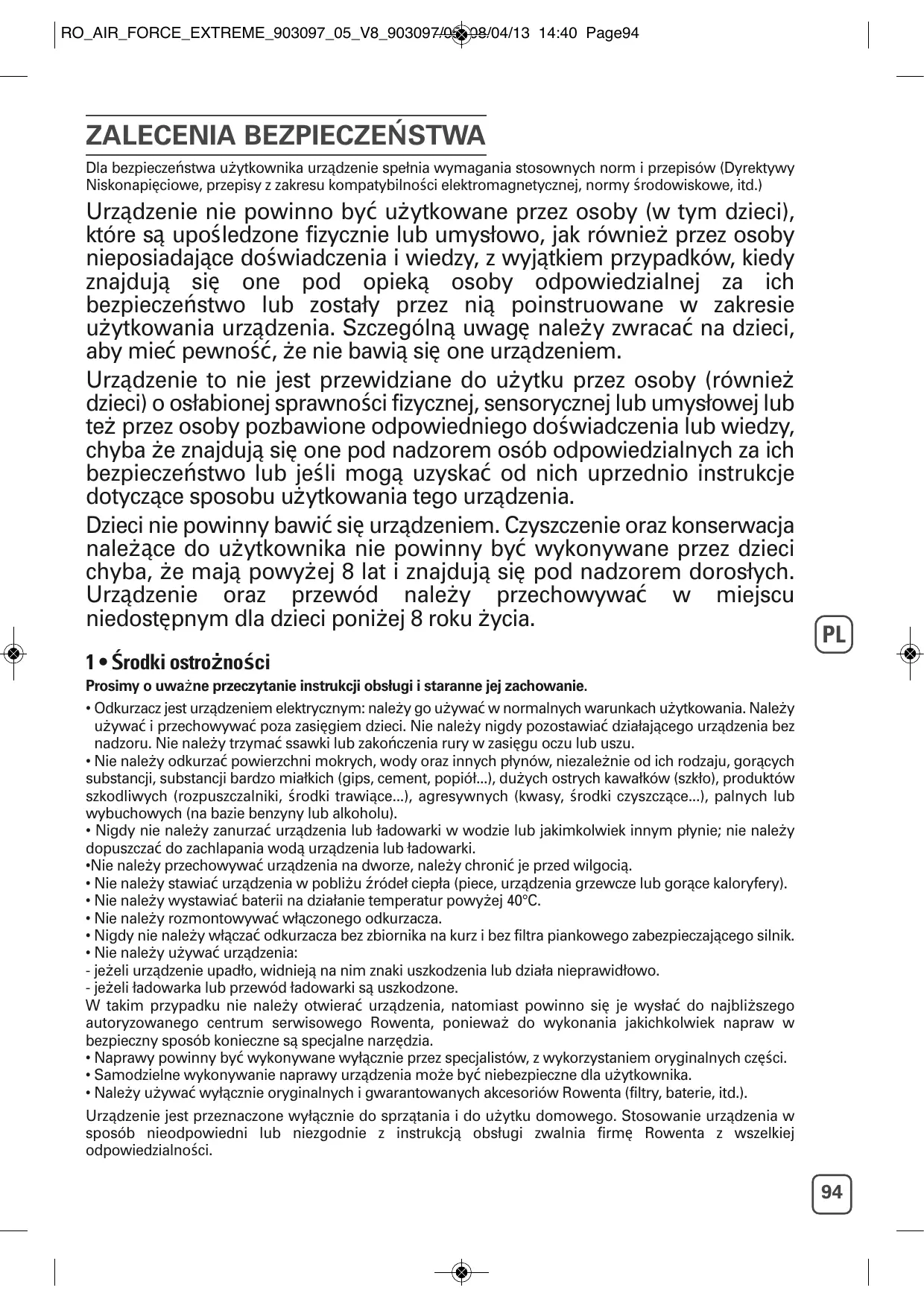 • Nale‹y u‹ywać wyłącznie oryginalnych i gwarantowanych akcesoriów Rowenta (filtry, baterie, itd.). Urządzenie jest przeznaczone wyłącznie do sprzątania i do u‹ytku domowego. Stosowanie urządzenia w sposób nieodpowiedni lub niezgodnie z instrukcją obsługi zwalnia firmę Rowenta z wszelkiej odpowiedzialności.