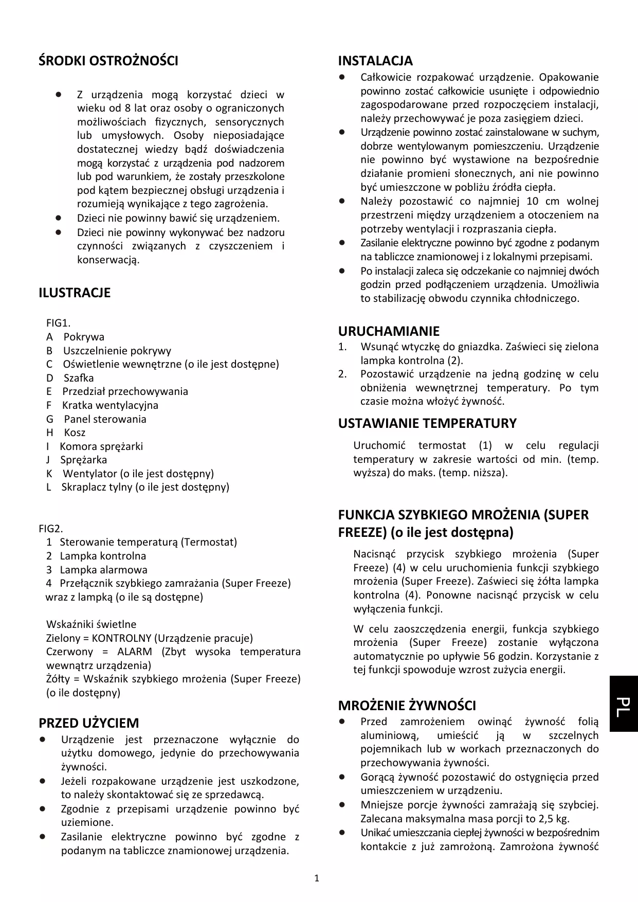ILUSTRACJE FIG1. A Pokrywa B Uszczelnienie pokrywy C Oświetlenie wewnętrzne (o ile jest dostępne) D Szafka E Przedział przechowywania F Kratka wentylacyjna G Panel sterowania H Kosz I Komora sprężarki J Sprężarka K Wentylator (o ile jest dostępny) L Skraplacz tylny (o ile jest dostępny) URUCHAMIANIE