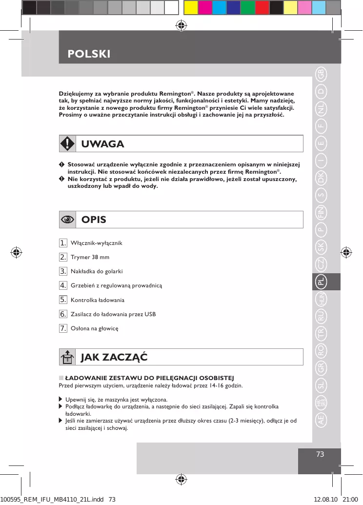 DK I UWAGA E F Dziękujemy za wybranie produktu Remington®. Nasze produkty są aprojektowane tak, by spełniać najwyższe normy jakości, funkcjonalności i estetyki. Mamy nadzieję, że korzystanie z nowego produktu firmy Remington® przyniesie Ci wiele satysfakcji. Prosimy o uważne przeczytanie instrukcji obsługi i zachowanie jej na przyszłość.