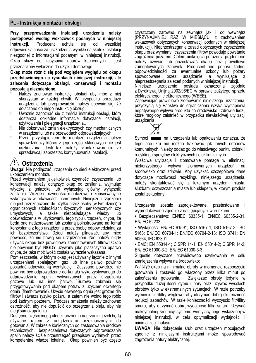 PL - Instrukcja montażu i obsługi czyszczony zarówno na zewnątrz jak i od wewnątrz (PRZYNAJMNIEJ RAZ W MIESIĄCU, z zachowaniem wskazówek dotyczących konserwacji podanych w niniejszej instrukcji). Nieprzestrzeganie zasad dotyczących czyszczenia okapu oraz wymiany i czyszczenia filtrów powoduje powstanie zagrożenia pożarem. Celem uniknięcia porażenia prądem nie należy używać lub pozostawiać okapu bez prawidłowo zamontowanych żarówek. Producent nie ponosi żadnej odpowiedzialności za ewentualne szkody lub pożary spowodowane przez urządzenie a wynikające z nieprzestrzegania zaleceń podanych w niniejszej instrukcji. Niniejsze urządzenie posiada oznaczenia zgodnie z Dyrektywą Unijną 2002/96/EC w sprawie zużytego sprzętu elektrycznego i elektronicznego (WEEE). Zapewniając prawidłowe złomowanie niniejszego urządzenia, przyczynią się Państwo do ograniczenia ryzyka wystąpienia negatywnego wpływu produktu na środowisko i zdrowie ludzi, które mogłoby zaistnieć w przypadku niewłaściwej utylizacji urządzenia. Przy przeprowadzaniu instalacji urządzenia należy postępować według wskazówek podanych w niniejszej instrukcji. Producent uchyla się od wszelkiej odpowiedzialności za uszkodzenia wynikłe na skutek instalacji niezgodnej z informacjami podanymi w niniejszej instrukcji. Okap służy do zasysania oparów kuchennych i jest przeznaczony wyłącznie do użytku domowego. Okap może różnić się pod względem wyglądu od okapu przedstawionego na rysunkach niniejszej instrukcji, ale zalecenia dotyczące obsługi, konserwacji i montażu pozostają niezmienione. Należy zachować instrukcję obsługi aby móc z niej skorzystać w każdej chwili. W przypadku sprzedaży urządzenia lub przeprowadzki, należy upewnić się, że dołączono do niego instrukcję obsługi. Uważnie zapoznać się z treścią instrukcji obsługi, która dostarcza dokładne informacje dotyczące instalacji, użytkowania i pielęgnacji urządzenia.. Nie dokonywać zmian elektrycznych czy mechanicznych w urządzeniu lub na przewodach odprowadzających. Przed przystąpieniem do montażu urządzenia należy sprawdzić czy któraś z jego części składowych nie jest uszkodzona. Jeśli tak, należy skontaktować się ze sprzedawcą i zaprzestać kontynuowania instalacji. Symbol na urządzeniu lub opakowaniu oznacza, że tego produktu nie można traktować jak innych odpadów komunalnych. Należy oddać go do właściwego punktu zbiórki i recyklingu sprzętów elektrycznych i elektronicznych. Właściwa utylizacja i złomowanie pomaga w eliminacji niekorzystnego wpływu złomowanych urządzeń na środowisko oraz zdrowie. Aby uzyskać szczegółowe dane dotyczące możliwości recyklingu niniejszego urządzenia, należy skontaktować się z lokalnym urzędem miasta, służbami oczyszczania miasta lub sklepem, w którym produkt został zakupiony. Ostrzeżenia Uwaga! Nie podłączać urządzenia do sieci elektrycznej przed ukończeniem montażu. Przed wykonaniem jakiejkolwiek czynności czyszczenia lub konserwacji należy odłączyć okap od zasilania, wyjmując wtyczkę z gniazdka lub wyłączając główny wyłącznik zasilania. Wszelkie czynności montażowe i konserwacyjne wykonywać w rękawicach ochronnych. Niniejsze urządzenie nie jest przeznaczone do użytku przez osoby (w tym dzieci) o ograniczonych zdolnościach fizycznych, sensorycznych czy umysłowych, a także nieposiadające wiedzy lub doświadczenia w użytkowaniu tego typu urządzeń, chyba, że będą one nadzorowane lub zostaną poinstruowane na temat korzystania z tego urządzenia przez osobę odpowiedzialną za ich bezpieczeństwo. Dzieci należy pilnować, aby mieć pewność, że nie bawią się urządzeniem. Nie należy nigdy używać okapu bez prawidłowo zamontowanych filtrów! Okap nie powinien być NIGDY używany jako płaszczyzna oparcia chyba, że taka możliwość została wyraźnie wskazana. Pomieszczenie, w którym okap jest używany łącznie z innymi urządzeniami spalającymi gaz lub inne paliwo powinno posiadać odpowiednią wentylację. Zasysane powietrze nie powinno być odprowadzane do kanału wykorzystywanego do odprowadzania spalin wytwarzanych przez urządzenia gazowe lub na inne paliwo. Surowo zabrania się przygotowywania pod okapem potraw z użyciem otwartego ognia (flambirowanie). Użycie otwartego ognia jest groźne dla filtrów i stwarza ryzyko pożaru, a zatem nie wolno tego robić pod żadnym pozorem. Podczas smażenia należy zachować ostrożność, aby nie dopuścić do przegrzania oleju, aby nie uległ samozapaleniu. Dostępne części mogą ulec znacznemu nagrzaniu, jeżeli będą używane razem z urządzeniami przeznaczonymi do gotowania. W zakresie koniecznych do zastosowania środków technicznych i bezpieczeństwa dotyczących odprowadzania spalin należy ściśle przestrzegać przepisów wydanych przez kompetentne władze lokalne. Okap powinien być często Urządzenie zostało zaprojektowane, przetestowane i wyprodukowane zgodnie z następującymi warunkami: